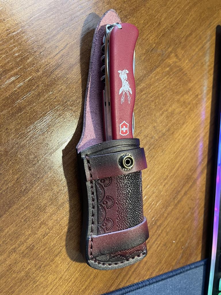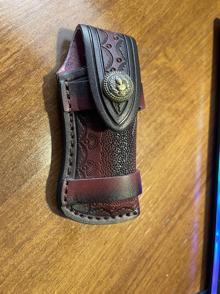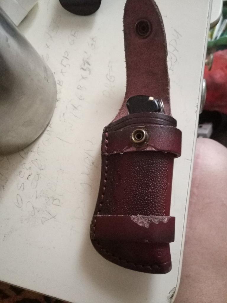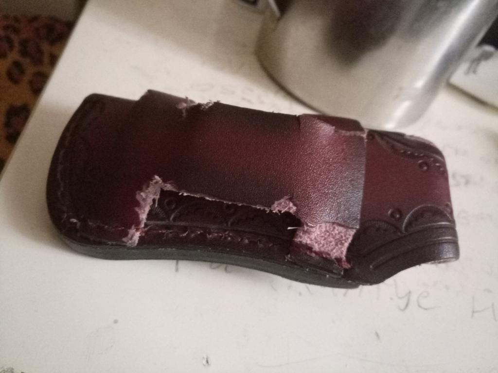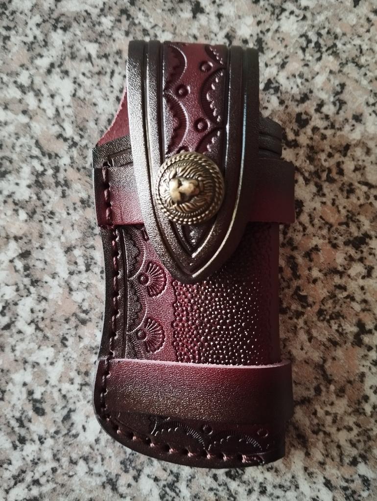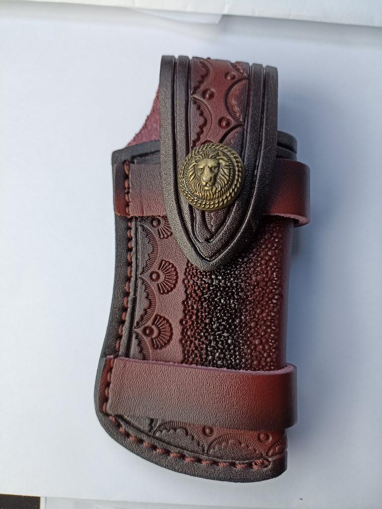 Sheath case for a small folding knife. The look is brutal. The assembly is good.