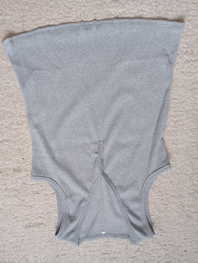 The color is dirty purple, the fabric looks like ribbed, but it's runny and doesn't hold its shape. The cut is weird, sticking out in the front and bunching up at the waist in the back.