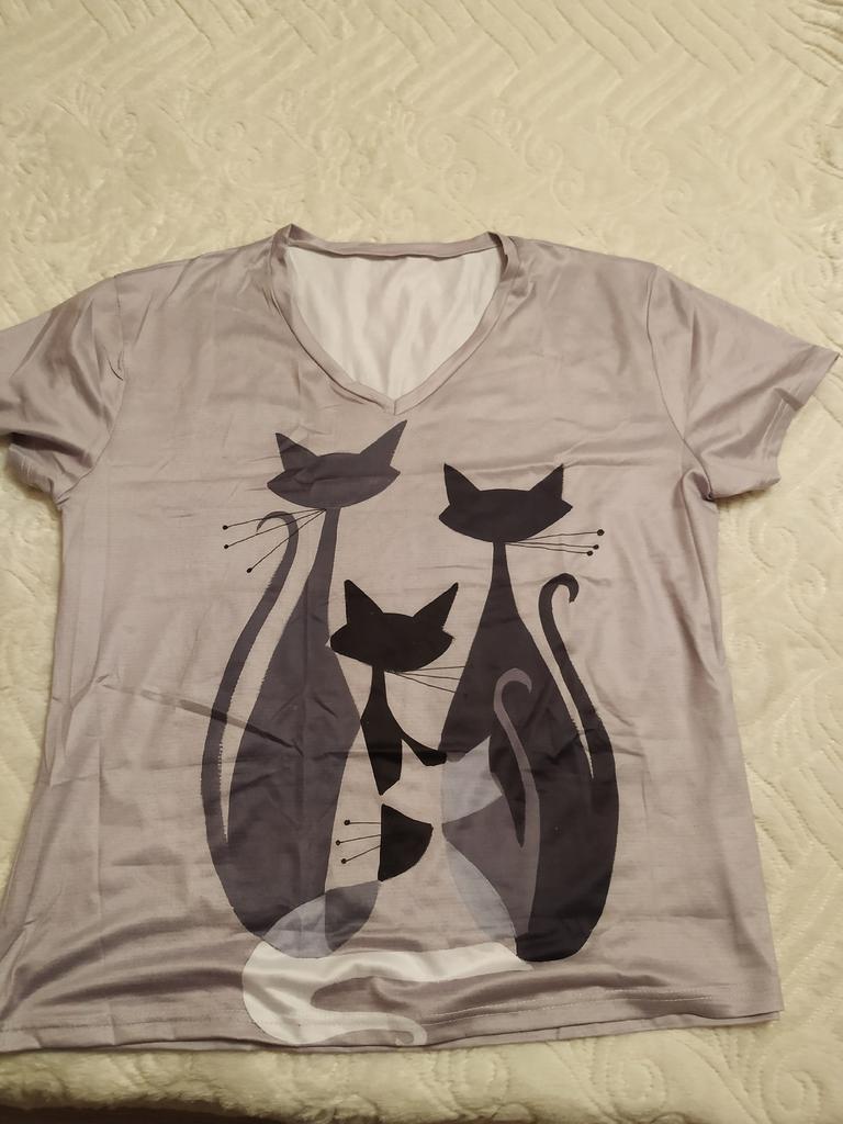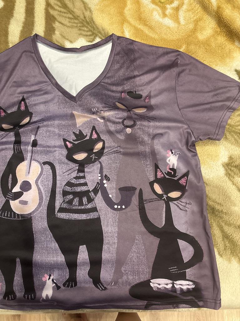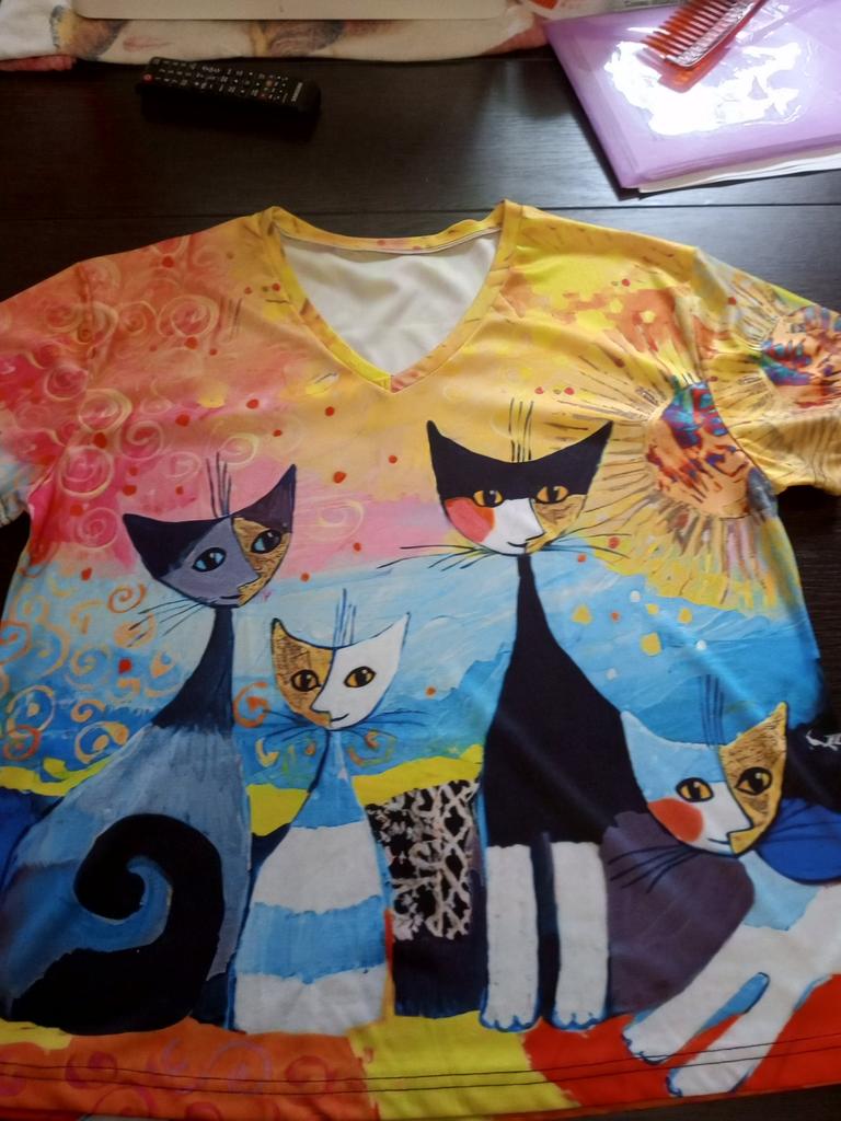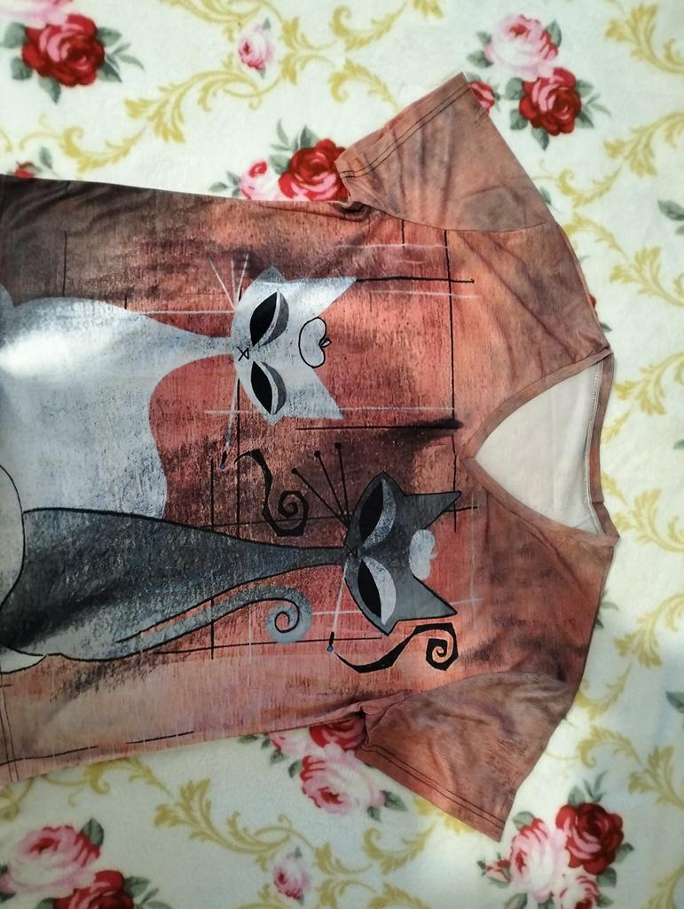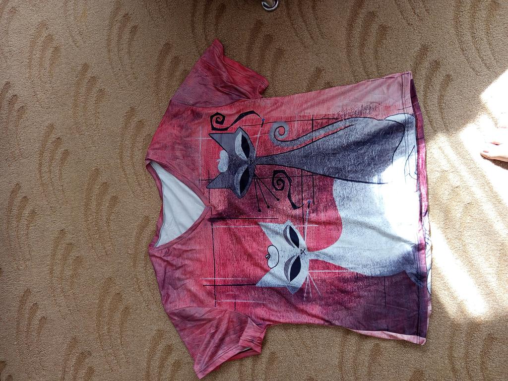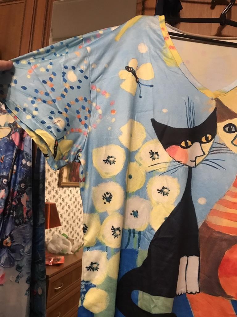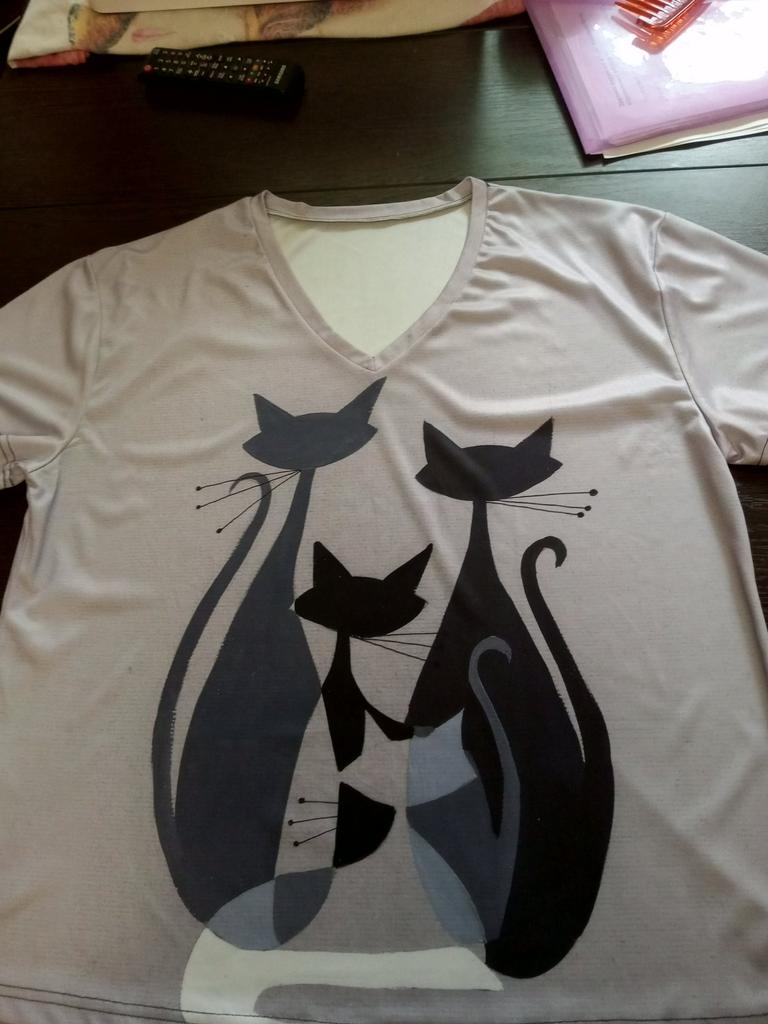 A completely different product arrived, an ordinary T-shirt, only very large. Everything is different - fabric, style, color!!! The cat is drawn. This is the first time such an outright deception on this site, it’s a pity for both the expectations and the wasted money.