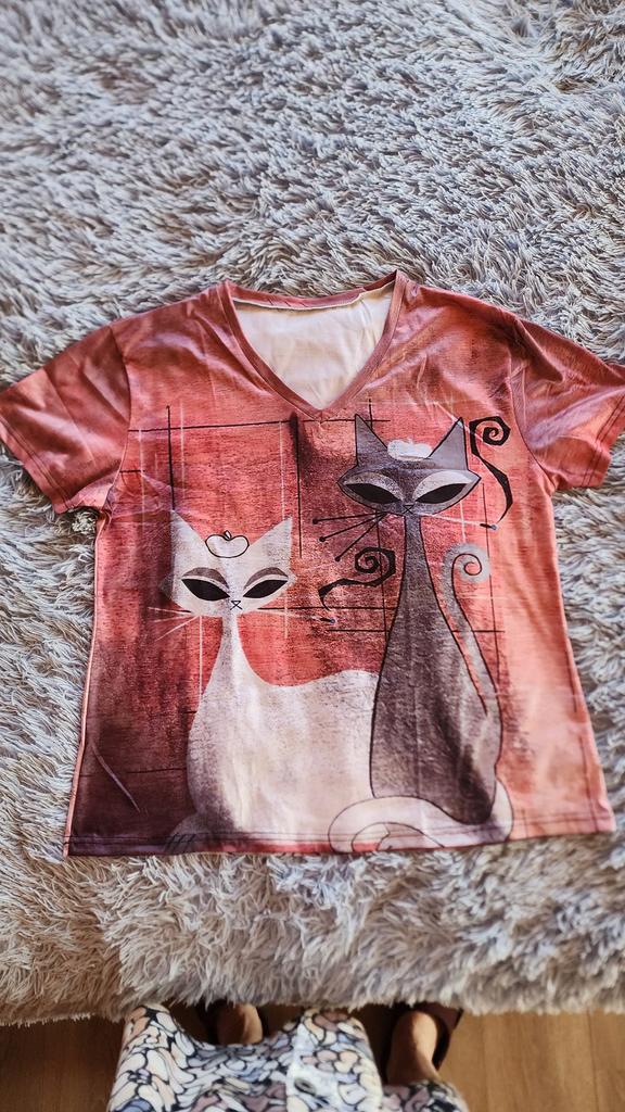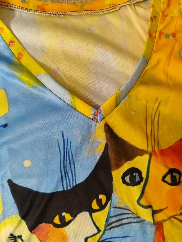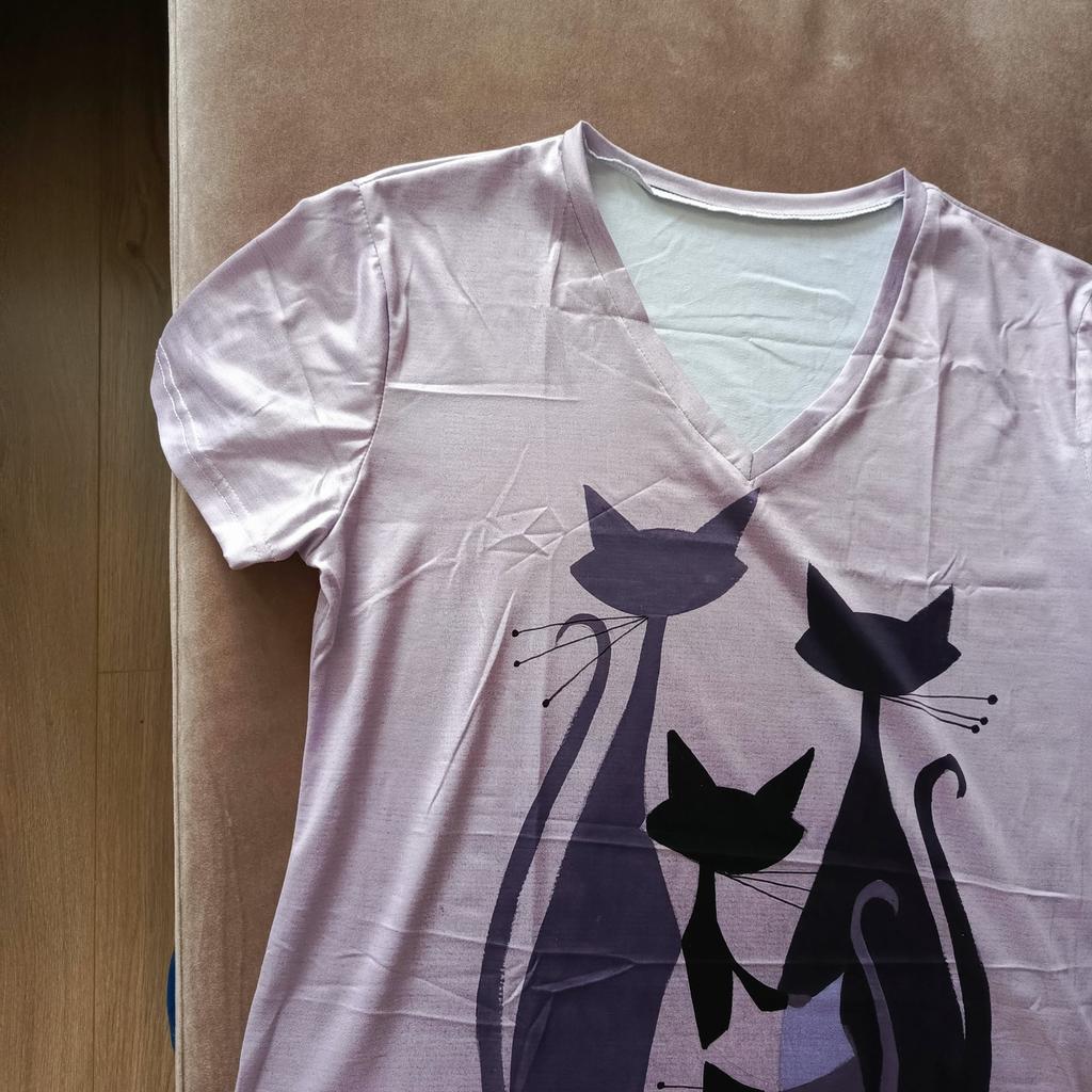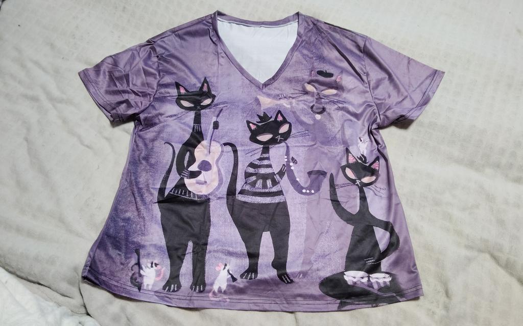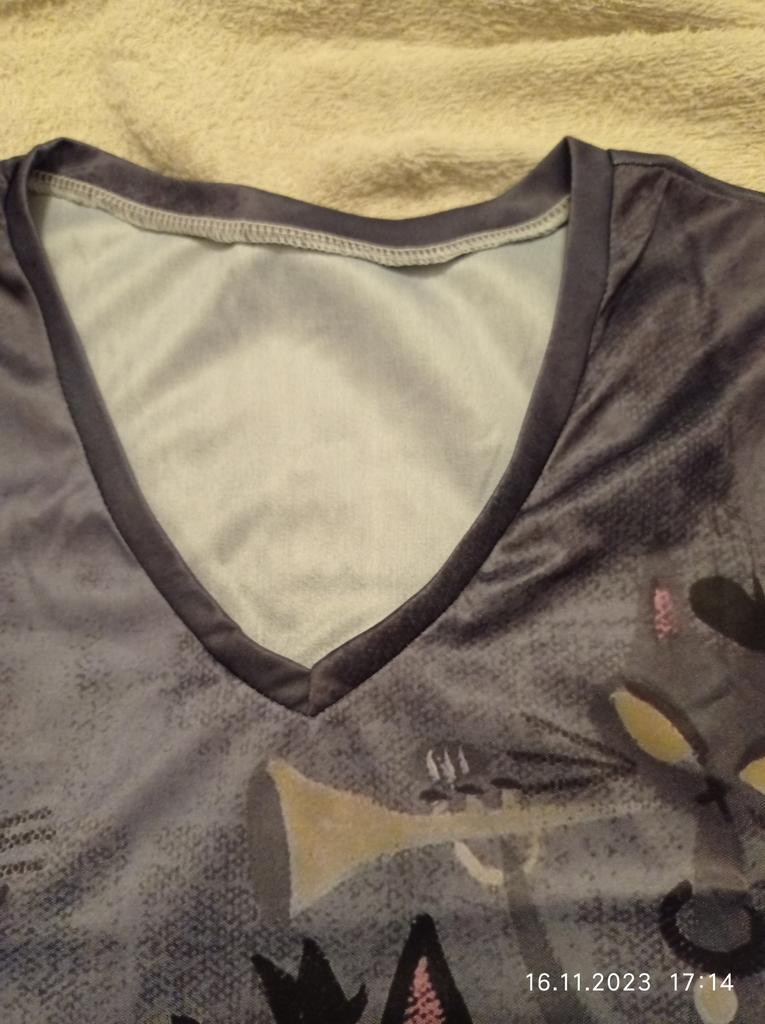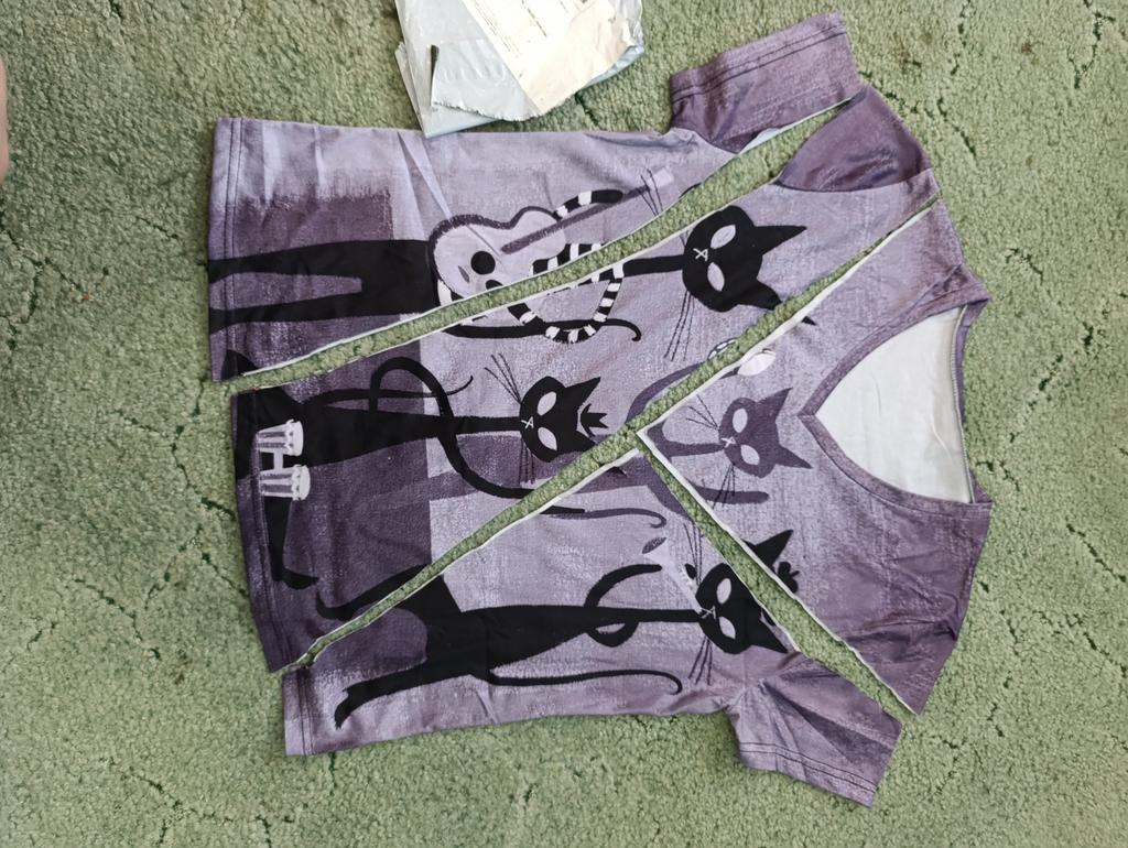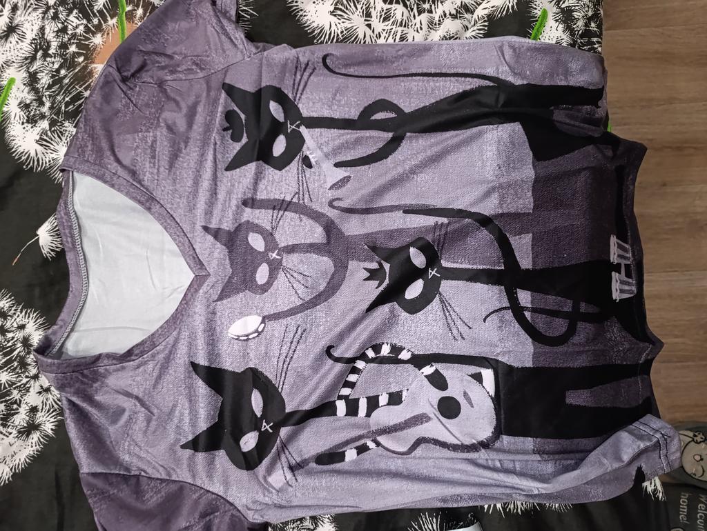 A completely different product arrived, an ordinary T-shirt, only very large. Everything is different - fabric, style, color!!! The cat is drawn. This is the first time such an outright deception on this site, it’s a pity for both the expectations and the wasted money.