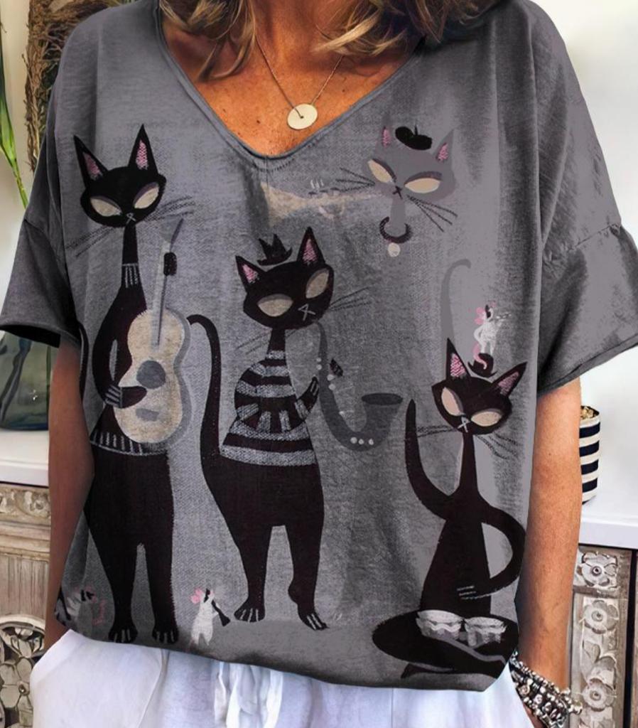 Women's Clothing Summer Retro Women's T Shirt Anime Cat Graphic V-neck Short Sleeve Casual Streetwear Oversized Women's Blouse