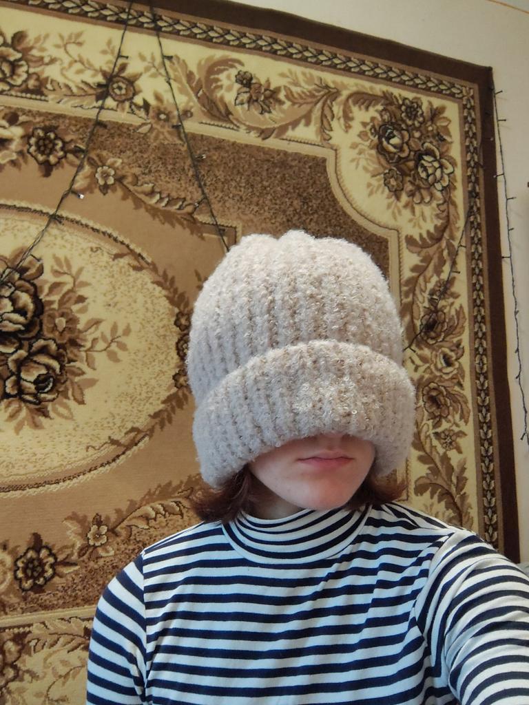 A strange hat, I can't figure out how to wear it. Soft yarn, synthetic but pleasant. The color is not bright white, but like ivory. Stretches well