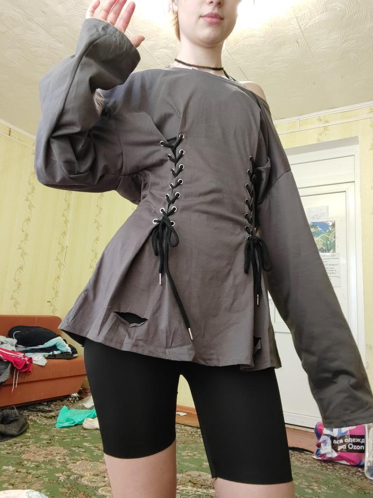 ⚠️ SCAM ALERT ⚠️ I have no words, if you order this, here is what you'll get: 1) The fabric is not at all as advertised, it is thin, like a t-shirt. 2) There is no gradient. You can clearly see in the photo that it goes from dark grey to light grey. What you receive is just one sad grey t-shirt. 3) The lining on the dress uses black threat, which makes for a beautiful contrast. What you get is poorly done simple grey stitching. 4) The black strings in the ad clearly have a great firm structure that allows them to stay up beautifully when tied. What you receive are soft, poor quality SHOE STRINGS. They do not stay up and you have to tie them all in yourself. 5) There is a random white patch/tag sewn onto the left sleeve that is clearly not there in the advertisement. 6) I have found at the very least EIGHT puncture holes in this garment. They are not big but considering the quality of the fabric, it worries me greatly that the fabric will continue to break apart from these holes while wearing the ''dress''. 7) You have to be extra small height-wise for this to be a dress. It isn't even a long t-shirt for most. All in all, it IS wearable I guess, but such a price for a crappy t-shirt is horrendous. Please be careful while purchasing 😟