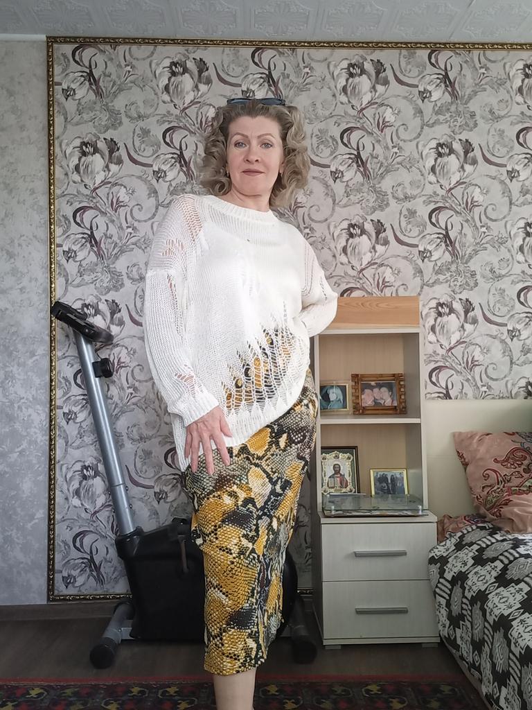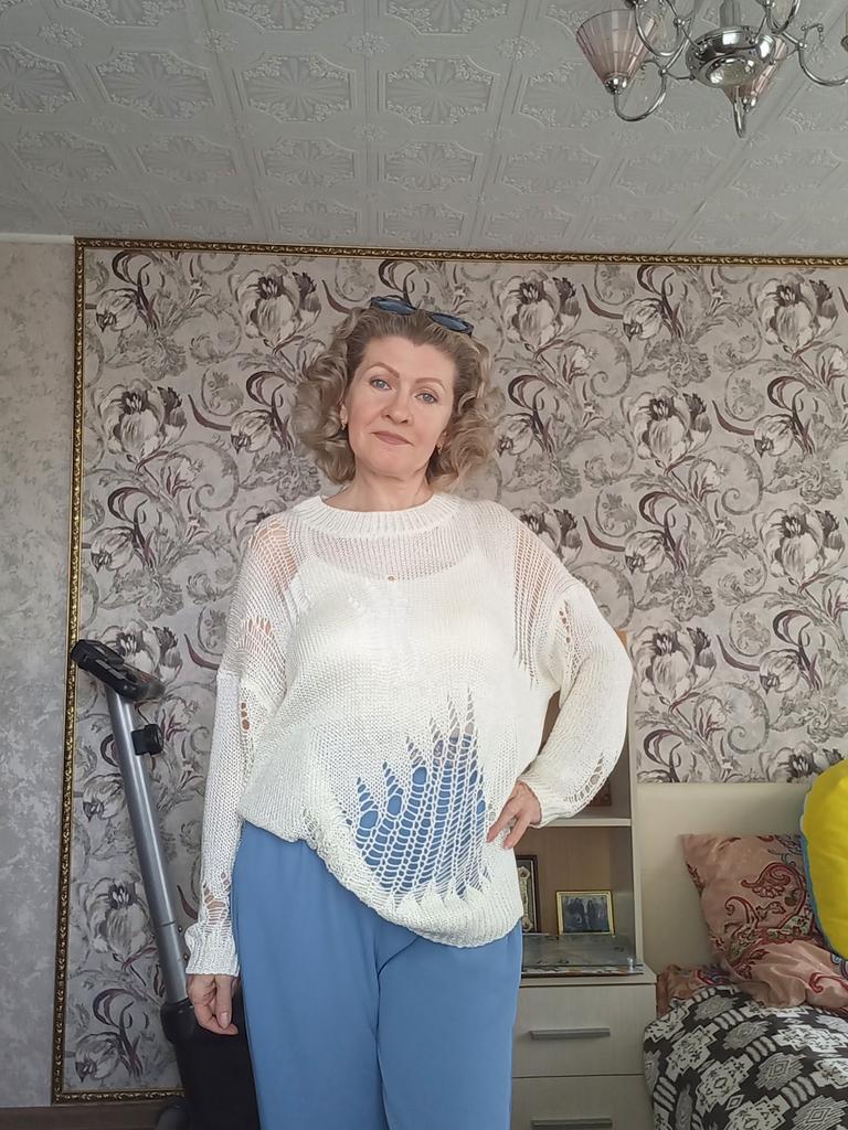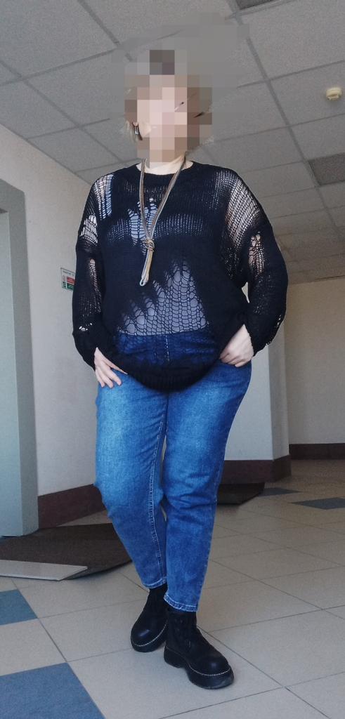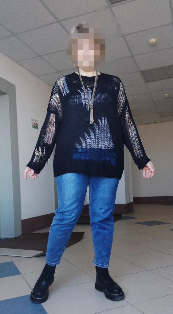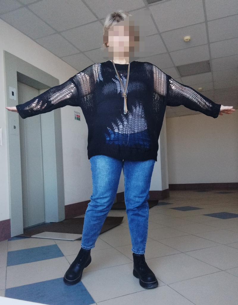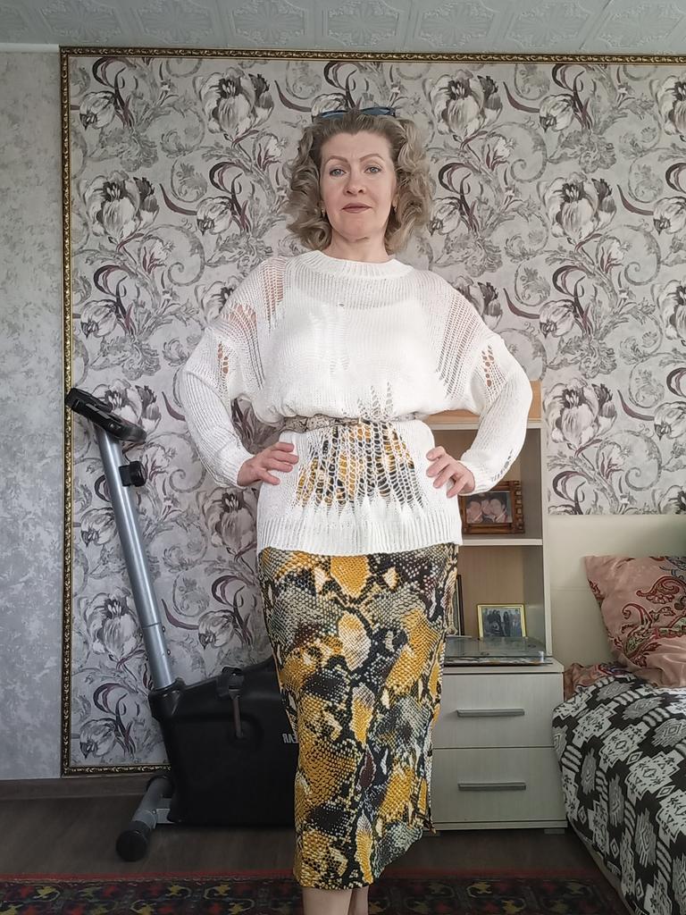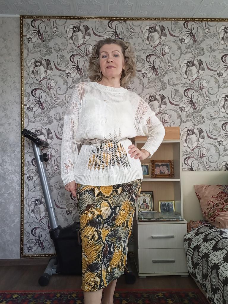 The tunic is very interesting, the size will fit up to size 58! It definitely needs to be worn with a contrasting T-shirt)