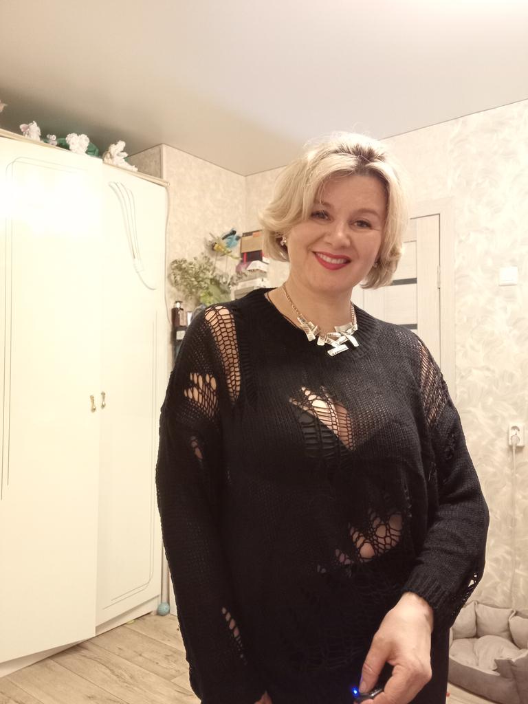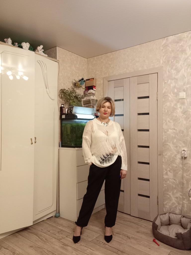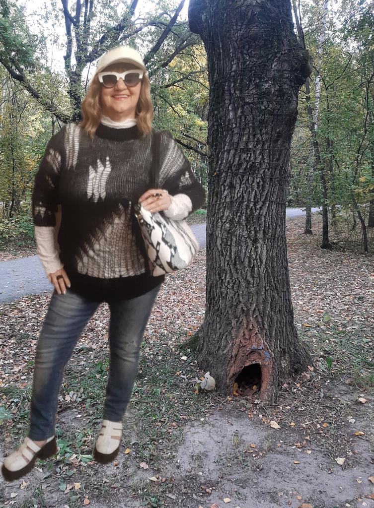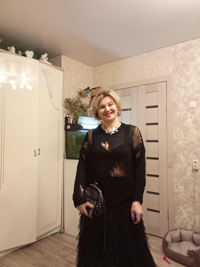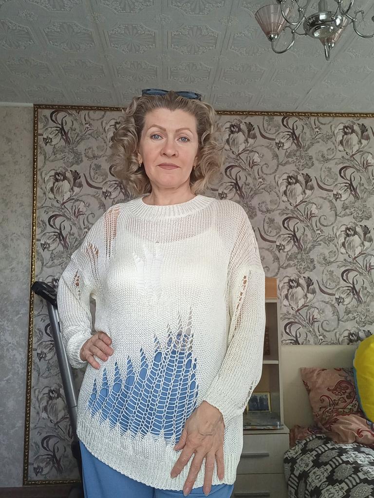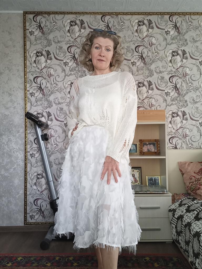 The tunic is very interesting, the size will fit up to size 58! It definitely needs to be worn with a contrasting T-shirt)
