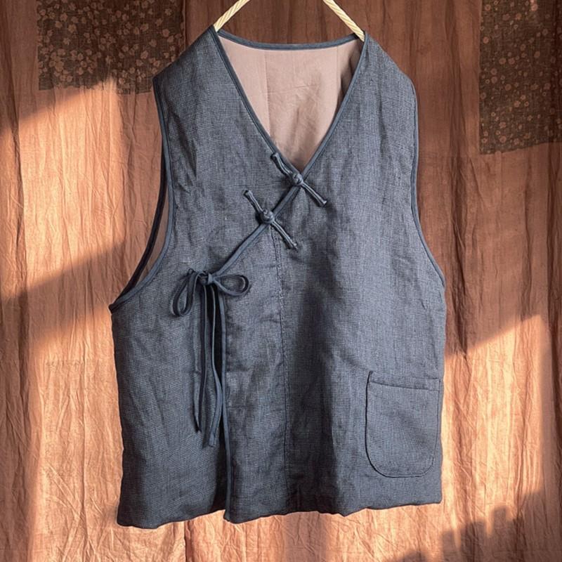 Johnature Women Chinese Style Linen Vests Coat V-Neck Sleeveless Patchwork Pockets Solid Color Fall Women Vintage Vests