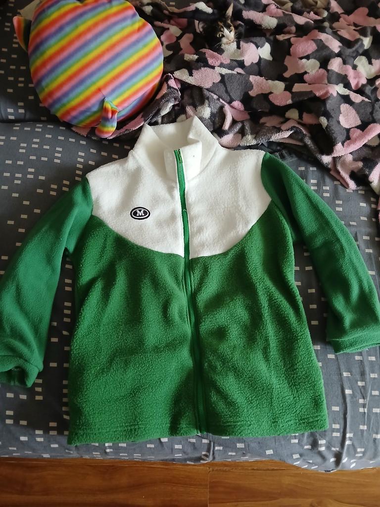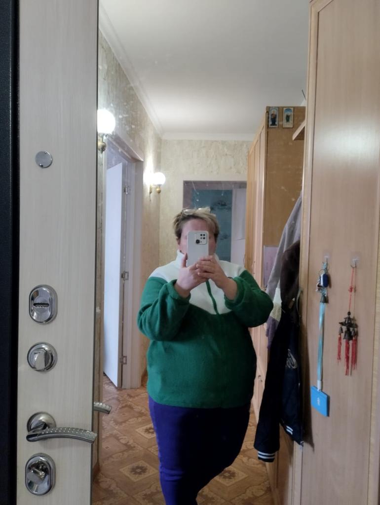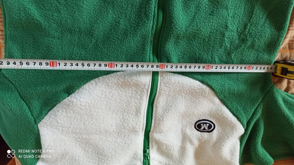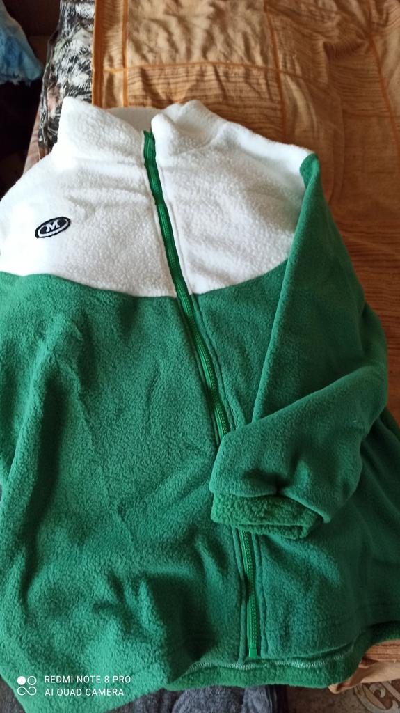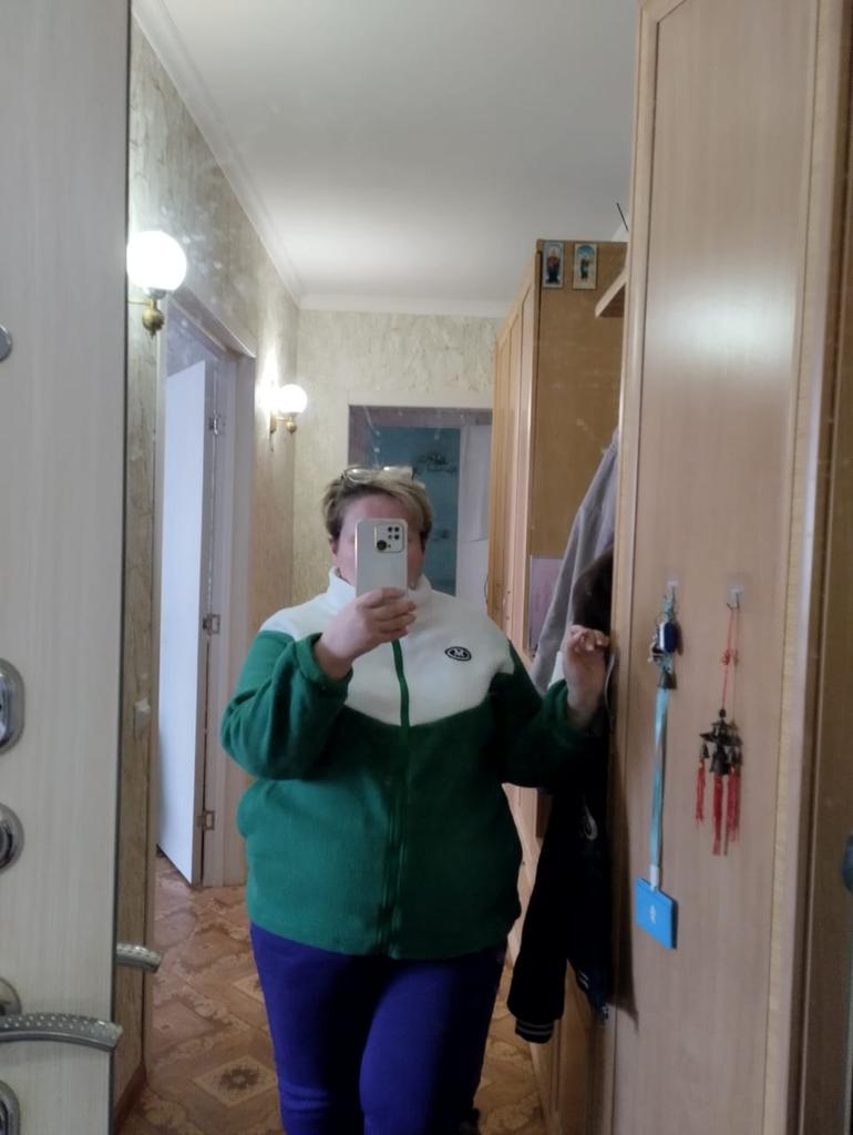 Fits size 52. Bust 106 cm. Warm. But the color in reality is not at all the same as in the photo. Words cannot describe it, it is green (light green). I could not display the same color in my photo.