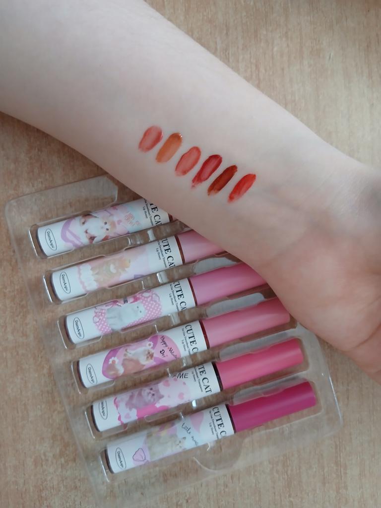 Review of the set of six lip glosses! Advantages: 1. The quality of the vials is better than I expected. 2. Cute print. 3. Low price. Of the shortcomings: 1. Too bright shades, making them look childish. 2. Liquid texture. 3. It's difficult to apply evenly on the lips. 4. Packaging defect (does not affect the product rating). 5. Play-Doh smell. Next, a subjective opinion: it feels unpleasant on the lips. The brush also causes not the best sensation. After application, itching appears, possibly an allergic reaction. Glad if my review was helpful, I will be grateful for a like and a subscription ❤️.