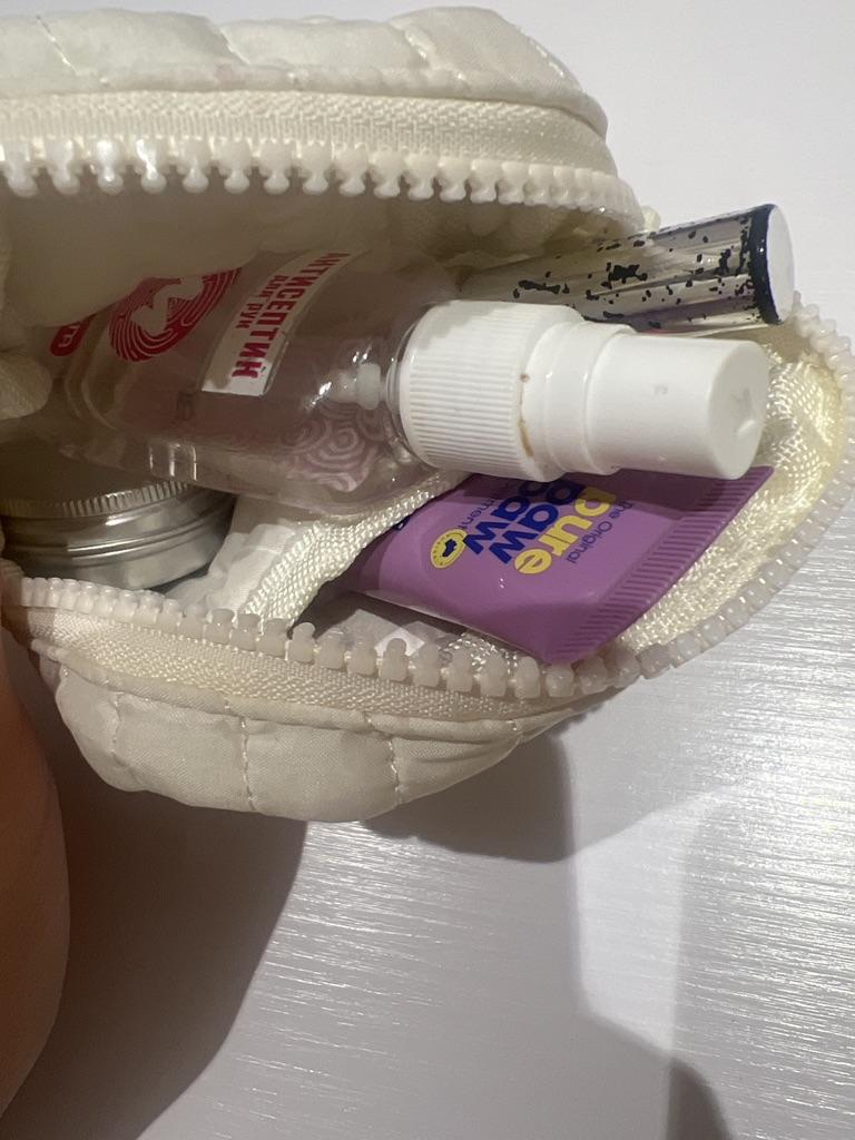 cosmetic bag super! it contained two pads, three balms, blush, a file, and three packs of chewing gum. I will wear it to school😊
