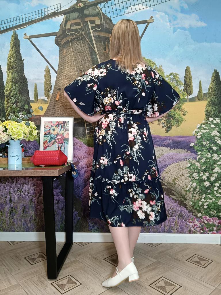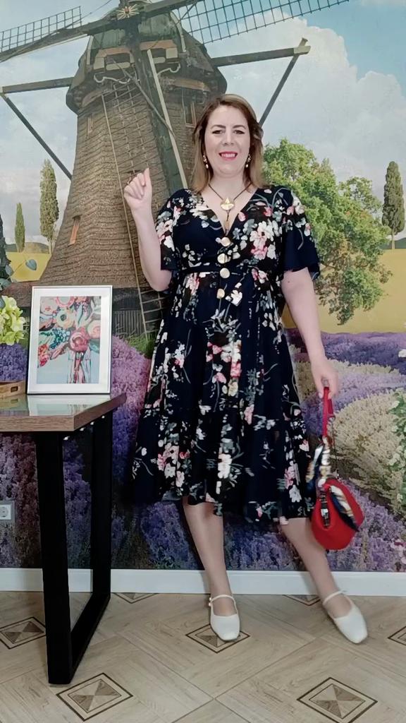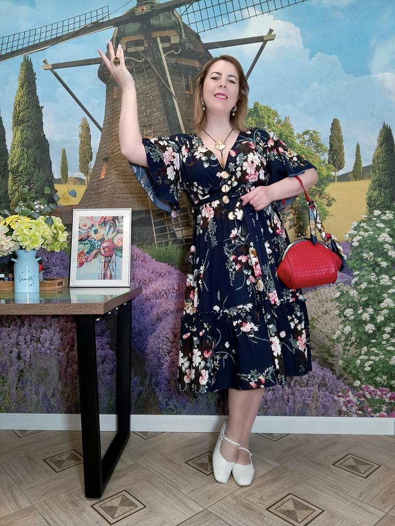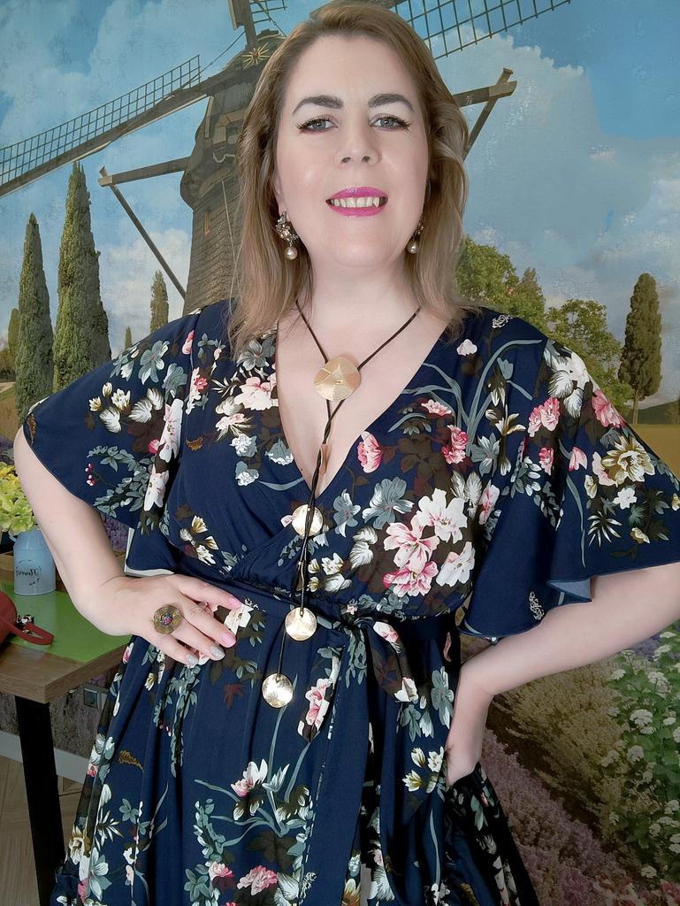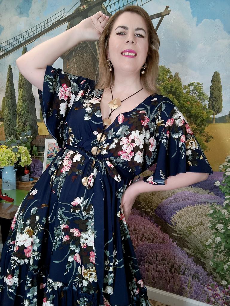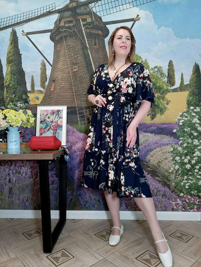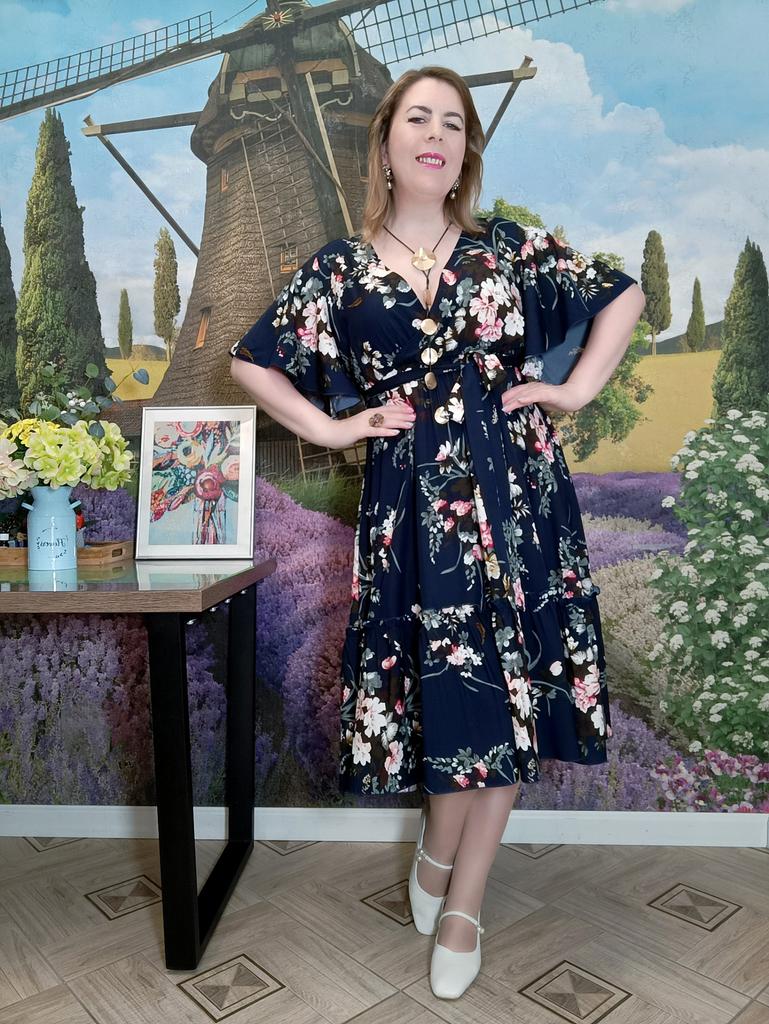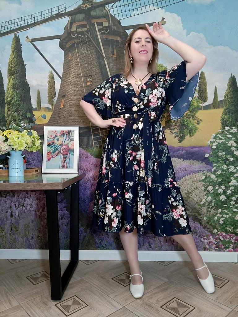 Printed summer dress in plus size This dress is exactly what you need for summer – light, breathable and flattering. The V-neck elongates the appearance of the neck, and the high waist flatters the figure and creates a feminine and elegant silhouette.. The botanical floral print on the dark blue background gives a classic combination of colors that suits almost any occasion – from going out with friends to a casual evening event.. The lightweight sleeve gives a feeling of airiness, and the midi-length skirt balances between comfort and elegance.. The fabric is pleasant to the touch, with a bit of stretch thanks to the spandex, and this adds a lot to the comfort throughout the day.. Perfect for those looking for a dress that is both beautiful and feels good on the body.