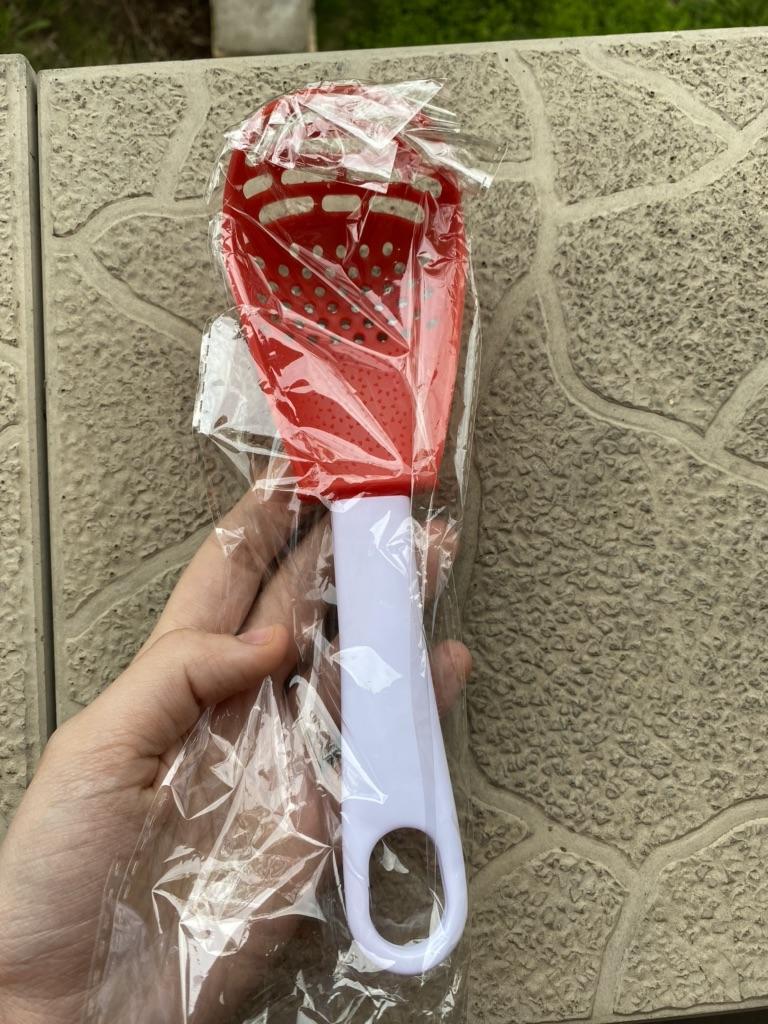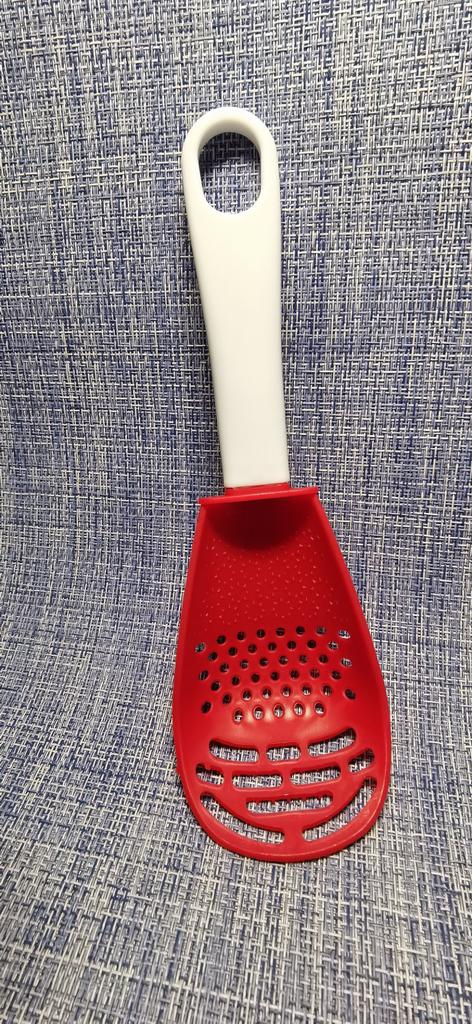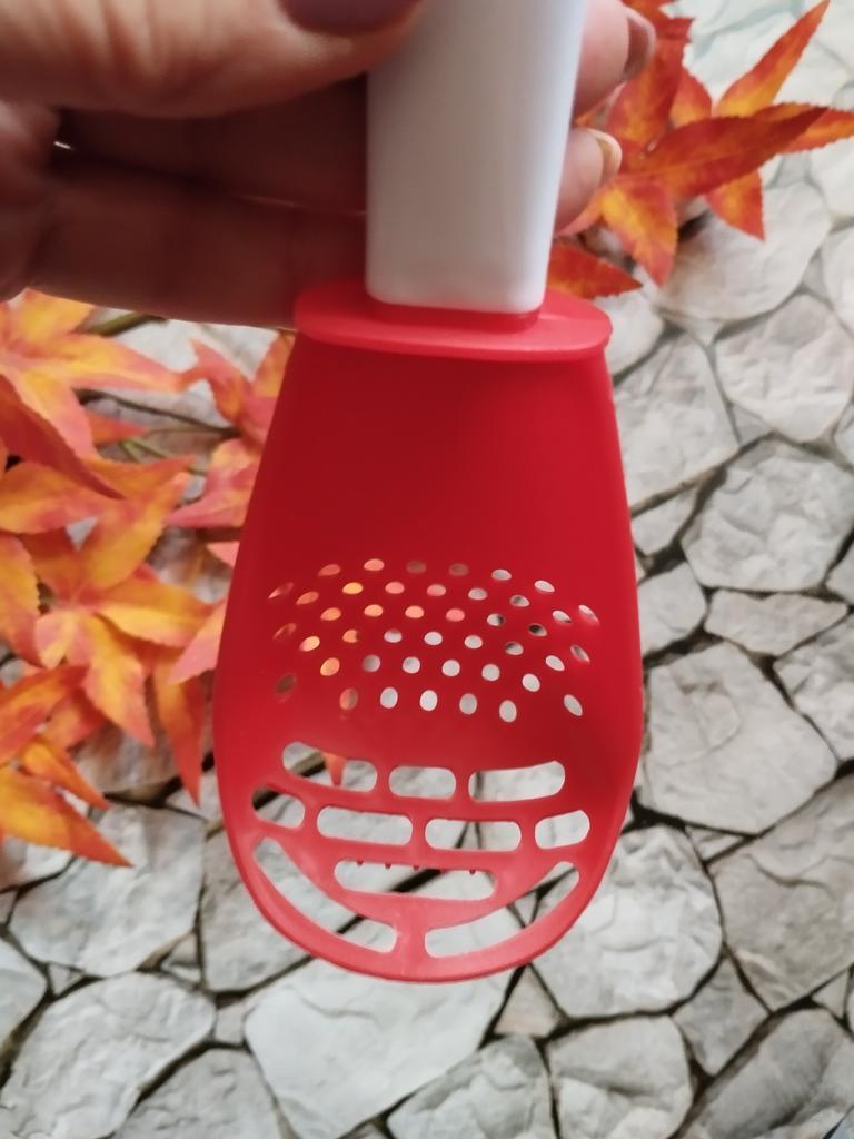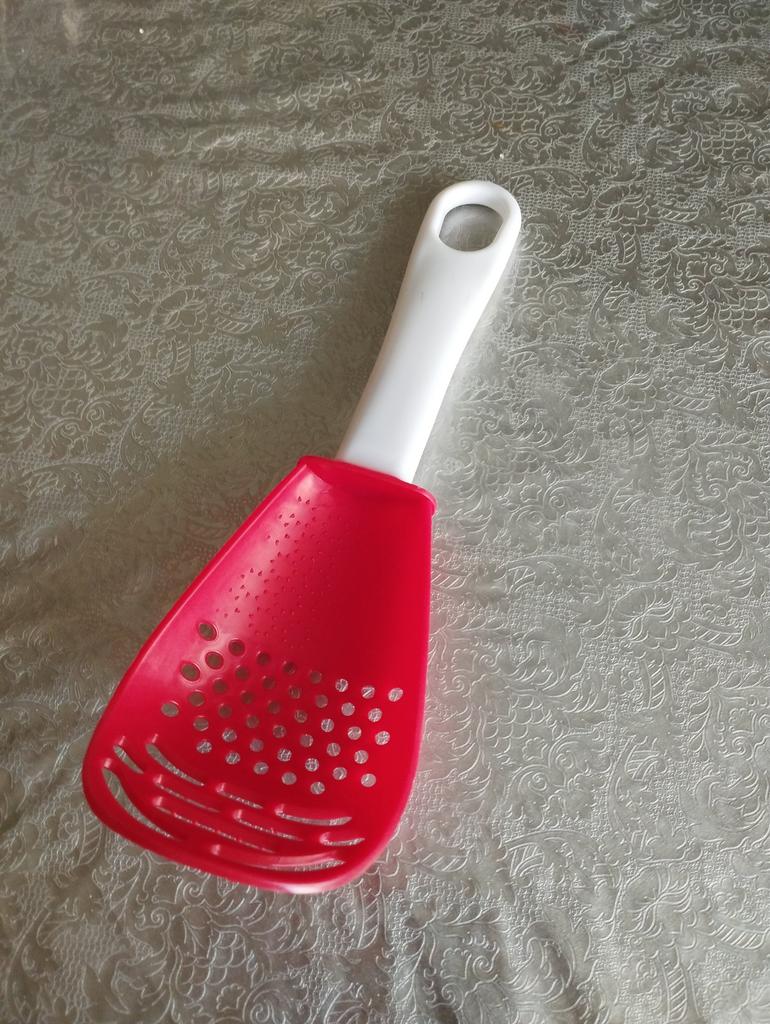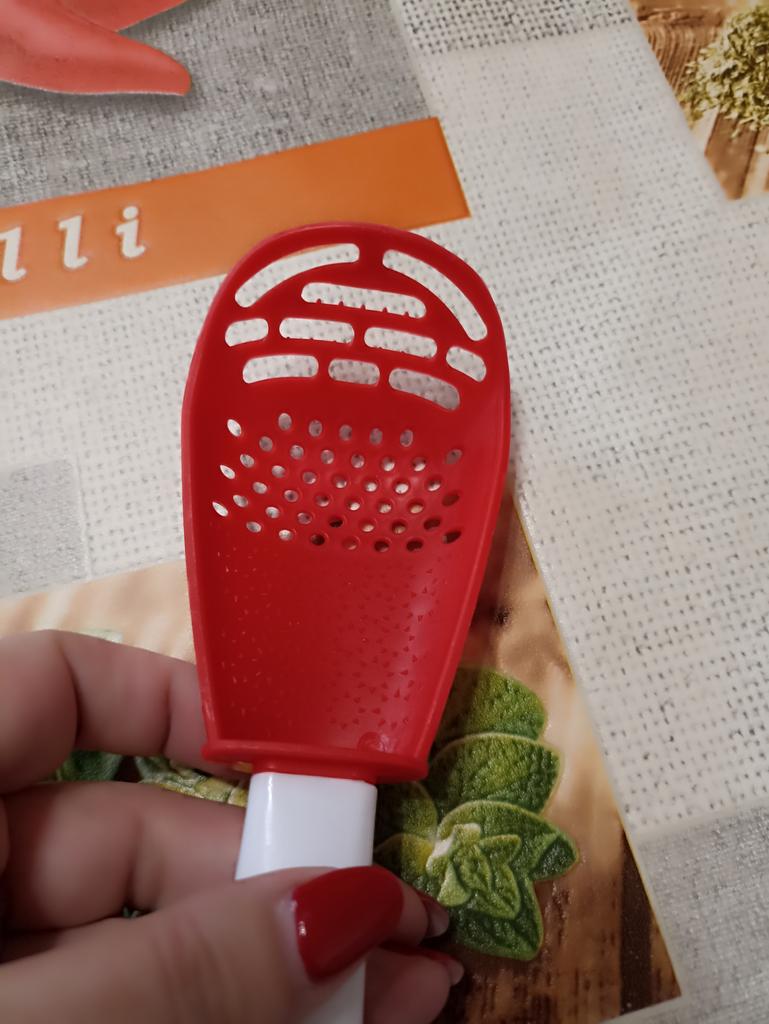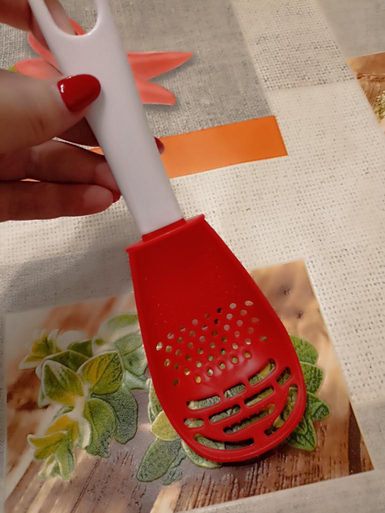 Multifunctional kitchen spoon π Delivery time: 34 days to Germany, a little longer than usual. Delivery was delayed but I received a discount as an apology. Scope of delivery β’οΈ: The scope of delivery includes a medium-sized KΓΌnen spoon. The product is available in 2 colors to choose from. I ordered it in red and am very happy with it. The product is ideal for food, fruit and vegetables, pasta π, berries etc. It is also suitable as a grater ππ. Total includes 3 functions, so it can replace 3 kitchen items. Great!ππππ Very comfortable and practical!!!! I didn't notice any disadvantages. The product is ideal when cooking various dishes. The size is great ππππ. The material is heat-resistant, anti-corrosion, non-toxic, has no unpleasant chemical smell. The design of the hook is very beautiful, it can be hung like I did. I can only recommend the product π, everything is great! Thanks Joom and the seller! 5 stars!βοΈβοΈβοΈβοΈ