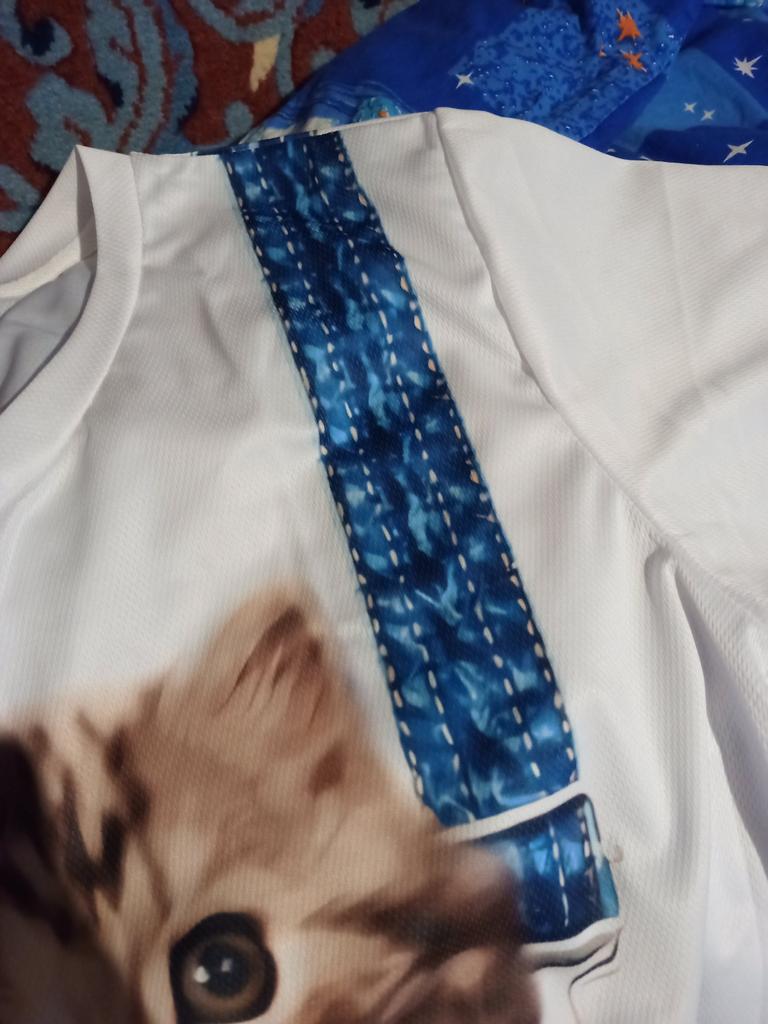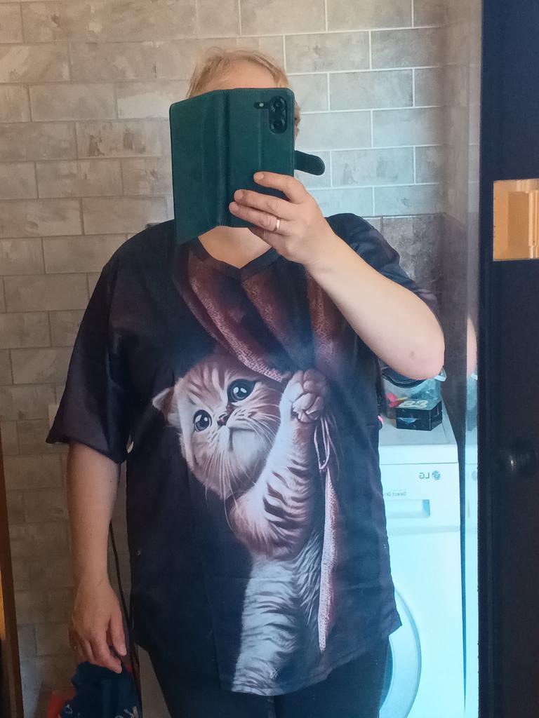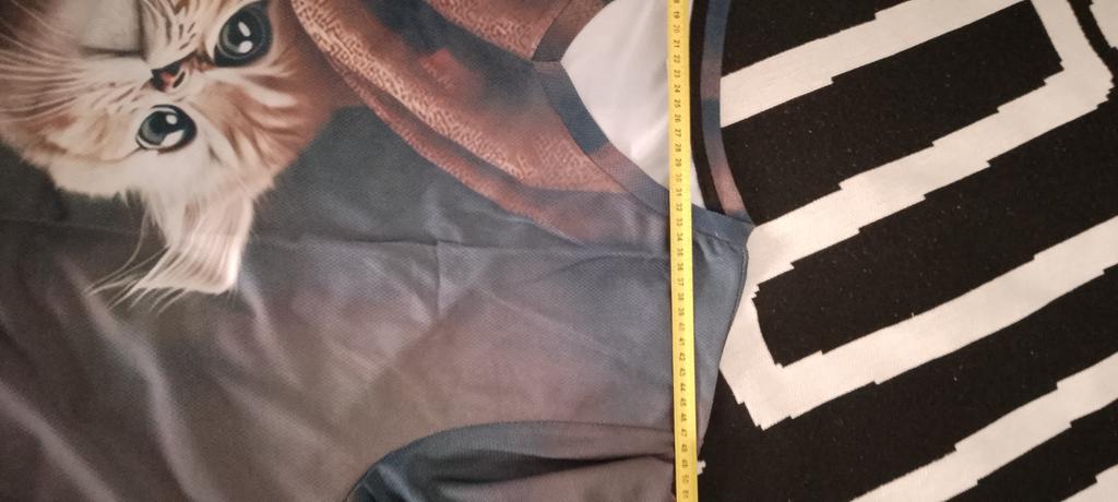 Excellent t-shirt! The kitten peeking out from behind the curtain is just right for me, a violinist! :-) The material is synthetic, so it will probably be hot in it in the heat. The colors are bright, the tailoring is neat. It attracts attention - even passers-by told me how beautiful my t-shirt was :-)