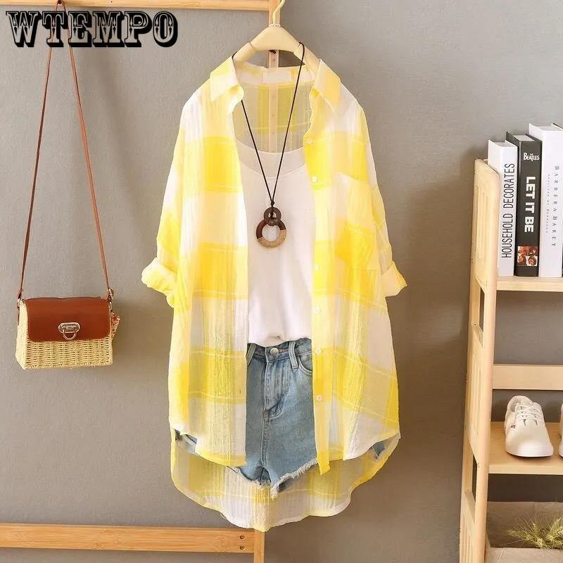 Women's Mid-length Plaid Shirt Long Loose Jacket Women's Sun Protection Clothing Large Size Loose Thin Jacket Ladies Long Chiffon Shirt