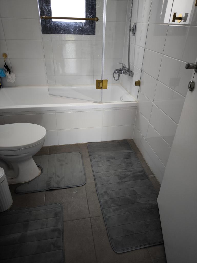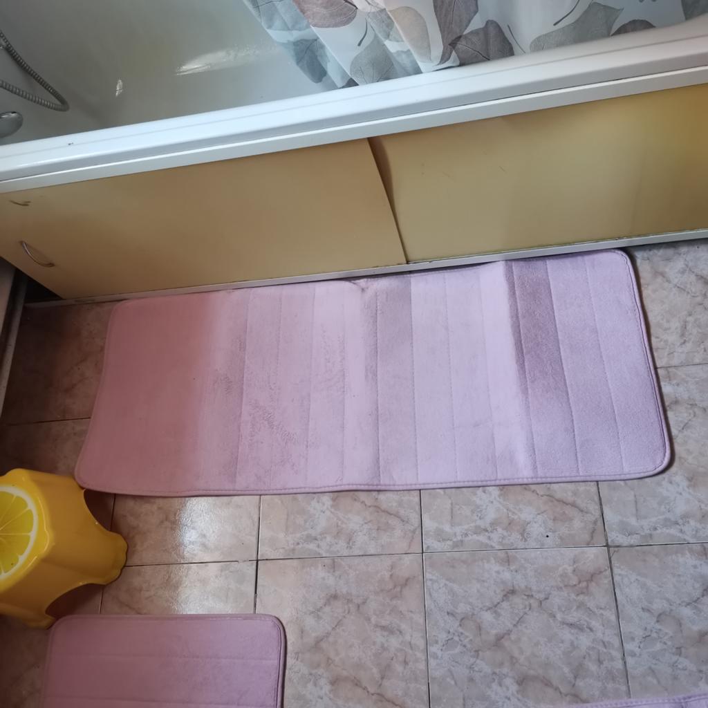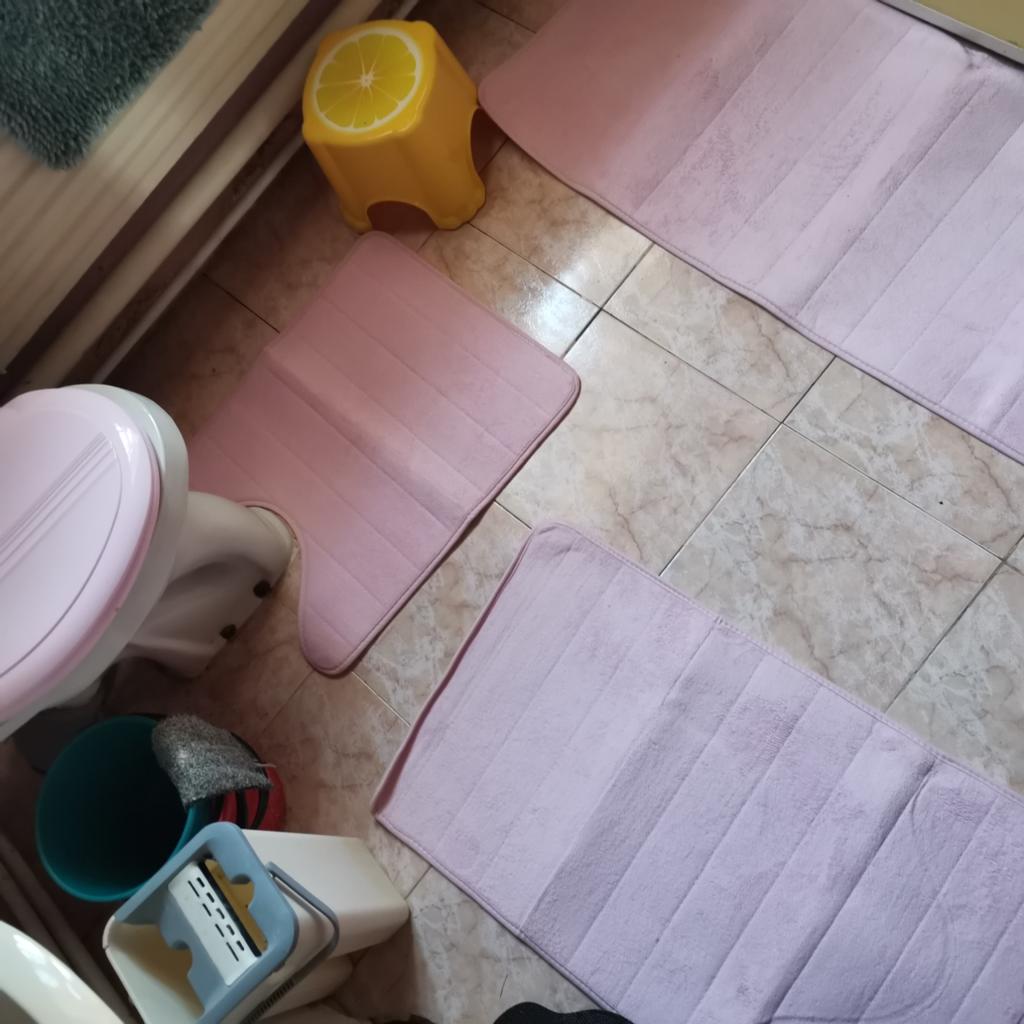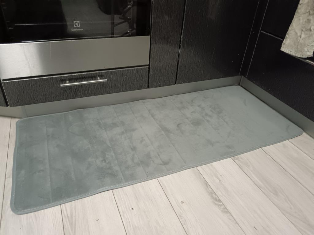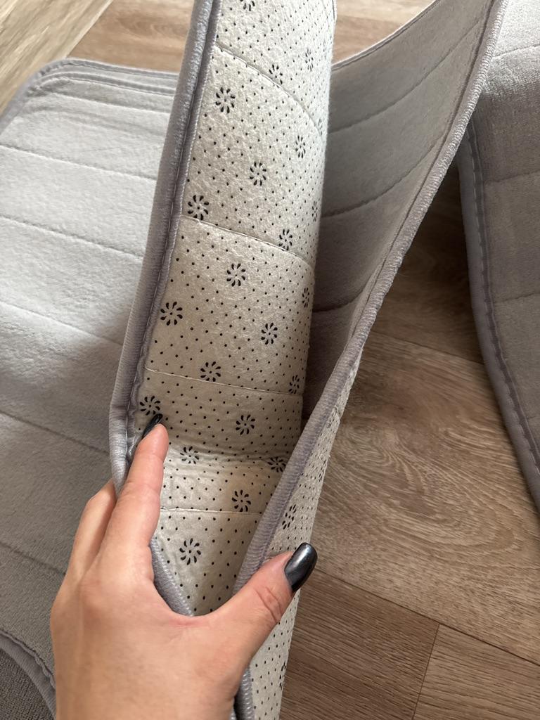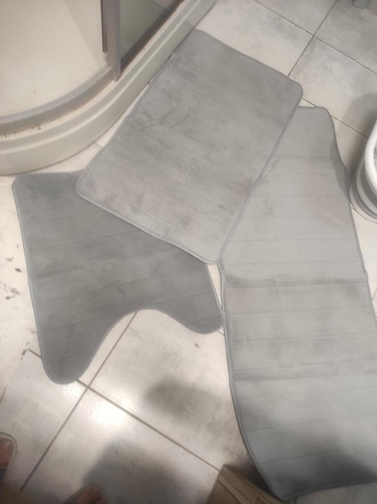 It's pleasant to step on the mats, they are soft. But they slip on porcelain stoneware! The cutout for the toilet didn't fit either, I had to trim it and re-edge it (see photo).