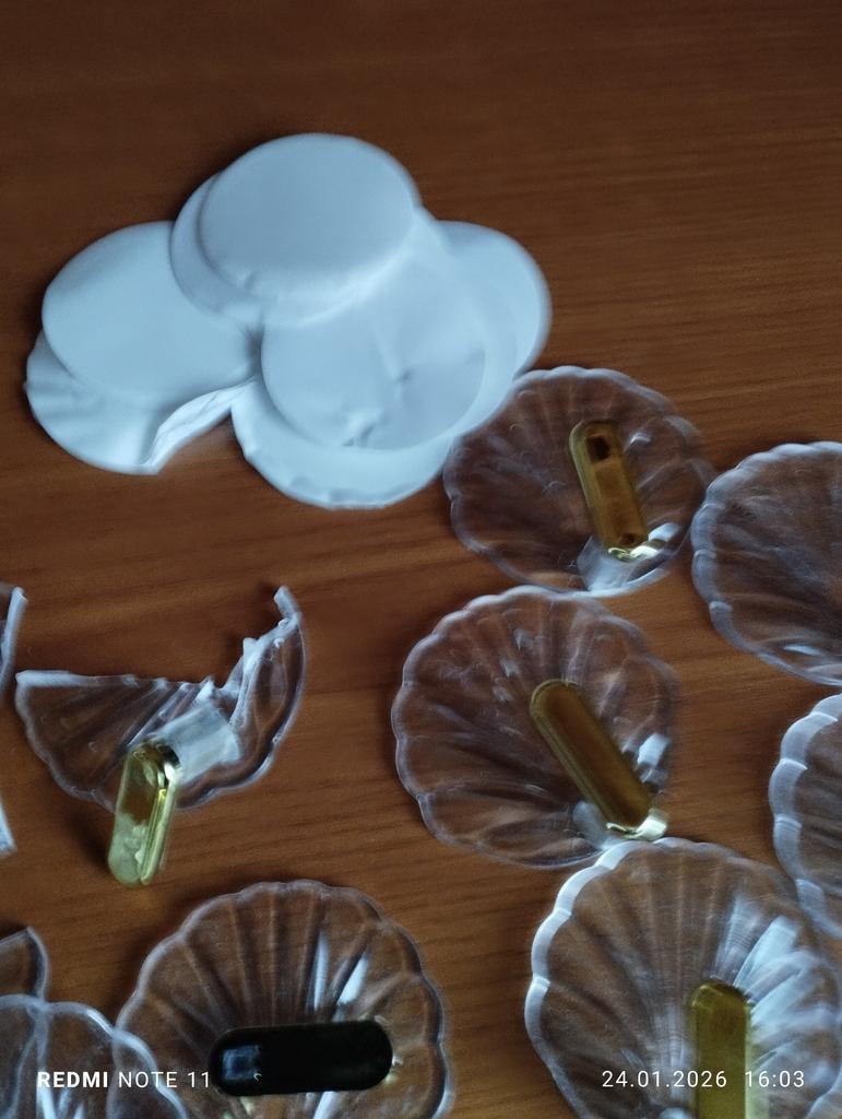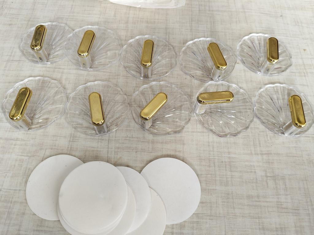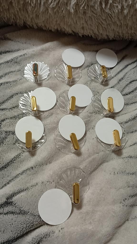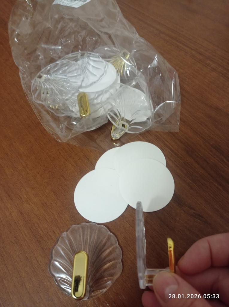 I received plastic hooks, I ordered them to hang all my necklaces. I didn't like the quality, but what can you expect, the price is low. The hooks are all somewhat scratched, the edges of the hooks are unfinished. On the side where the adhesive pad should be attached, the plastic is somewhat uneven - there's a bulge here, a recess there, I don't know how tightly they will adhere to the wall...