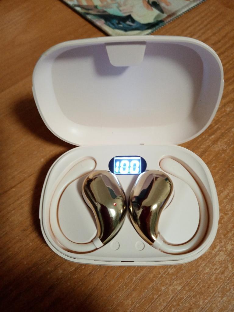 Good headphones, sound is clear. It's convenient that they attach behind the ear.
