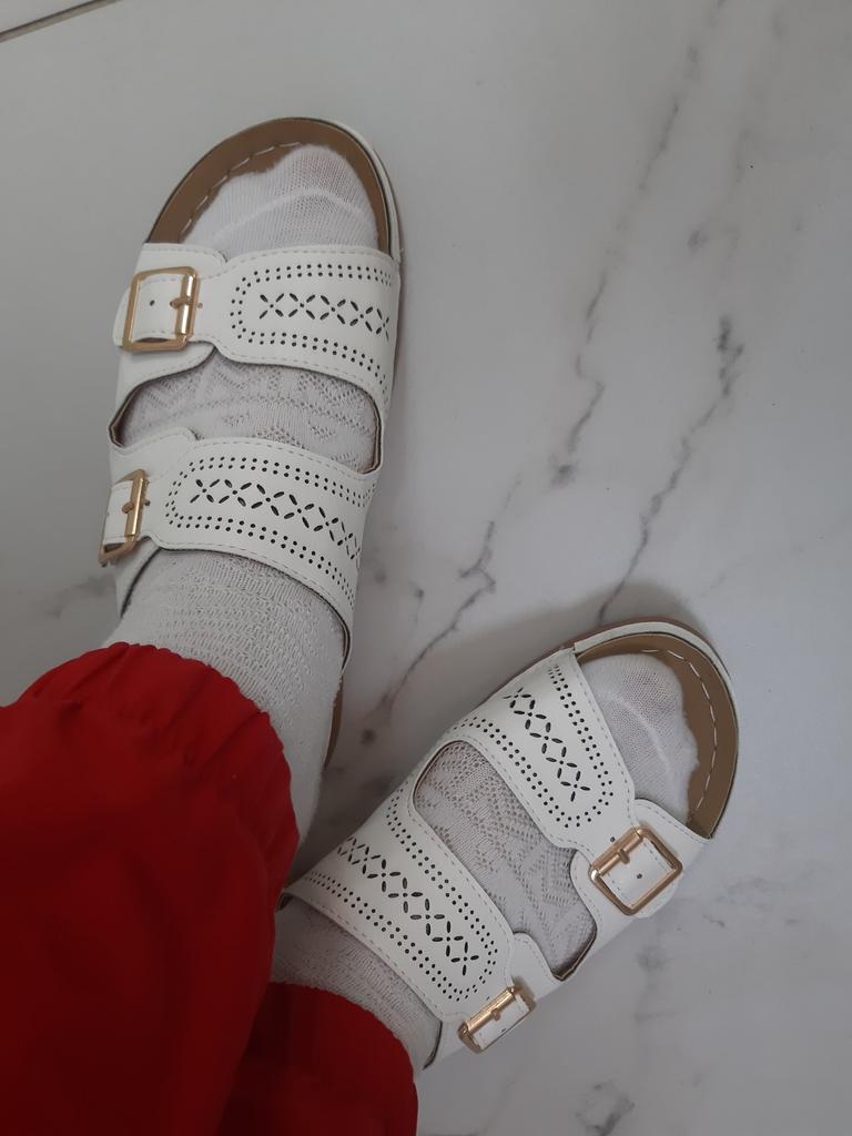 The sandals fit in size, but they are for a full foot, and I have a slender foot, so they stick out on both sides, which is not pretty.