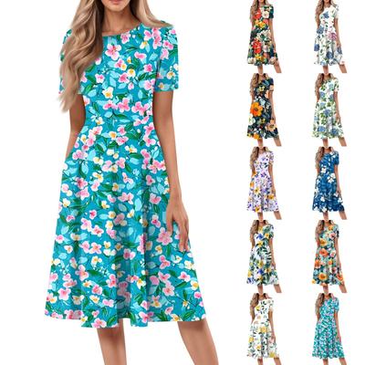 Women's Casual Fashion Round Neck Short Sleeve Floral Print Midi Dress