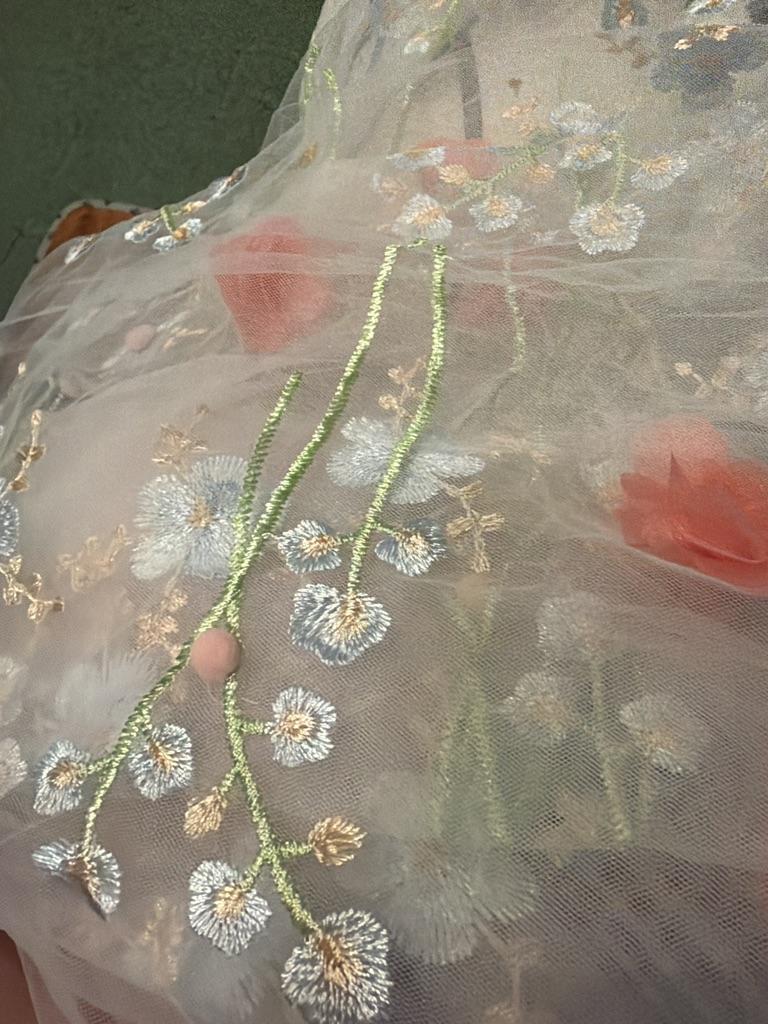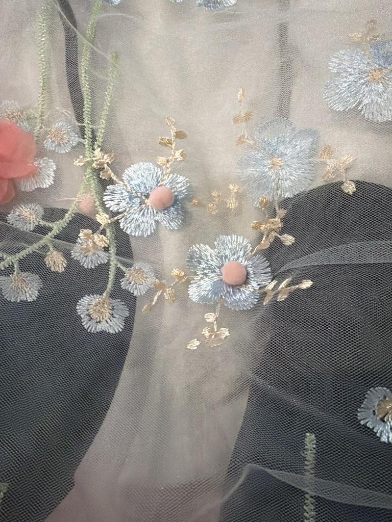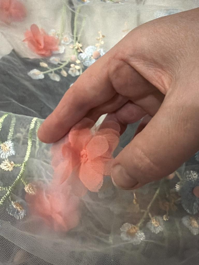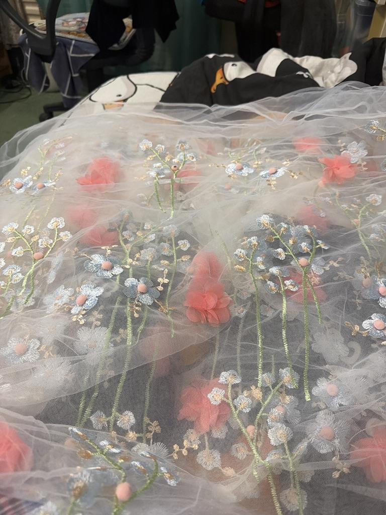 "New 3D Embroidered Lace Fabric with Beaded Petal Flowers for Women's Skirts"