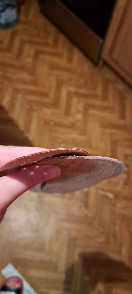 Not leather. More like pressed cardboard. They differ in thickness, the left one is twice as thick. Fake!