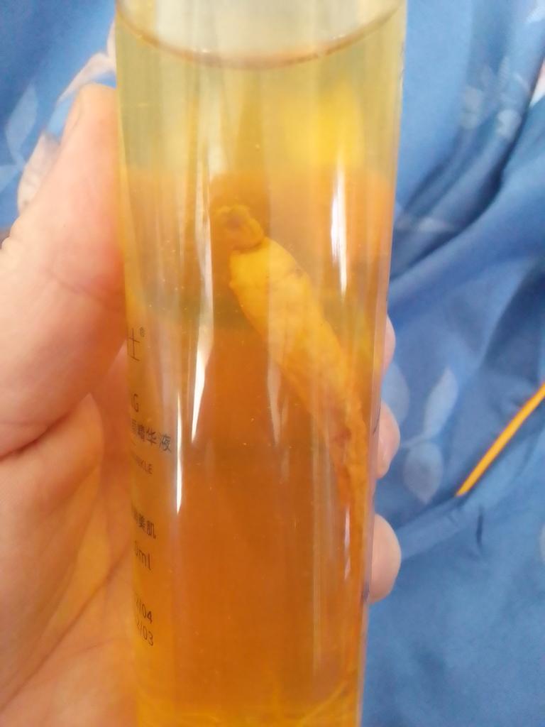 Not bad oil, cool presentation, a ginseng root floats in the oil