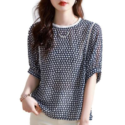 Dot Pattern Chiffon Lace Sheer Spring Long Pretty Slim Loose Spring LLL Navy [J-Scott] Blouse, Neck, Material, Half-sleeves, Sheer, Cool, Summer,