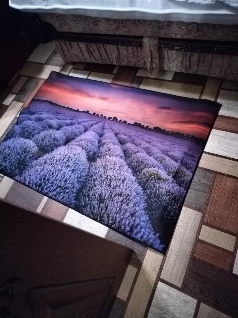 Was rolled up, I hope it will straighten out. Was packaged excellently, I barely managed to unpack it). The colors are saturated, but it looked a bit brighter on the phone screen. I wouldn't call it non-slip, it slides on the floor