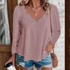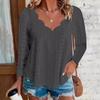 Scallop Trim V Neck T-Shirt, Casual Solid Color Lettuce Trim Eyelet Long Sleeve Top For Spring & Fall, Women's Clothing