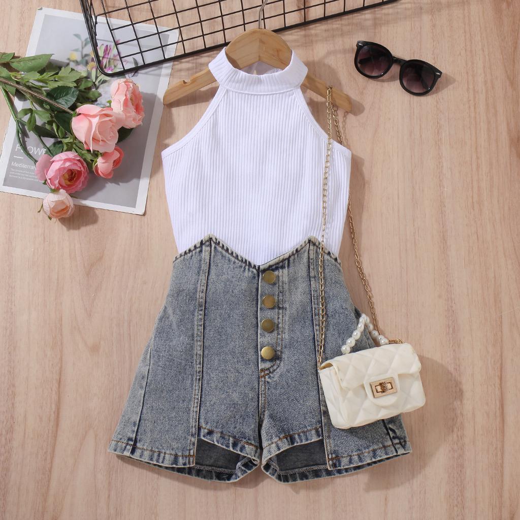 Girls' Fashion Set: Summer Children's Solid Color Sleeveless Off-the-shoulder Pullover, Ripped Denim Shorts Two-piece Set