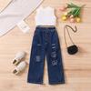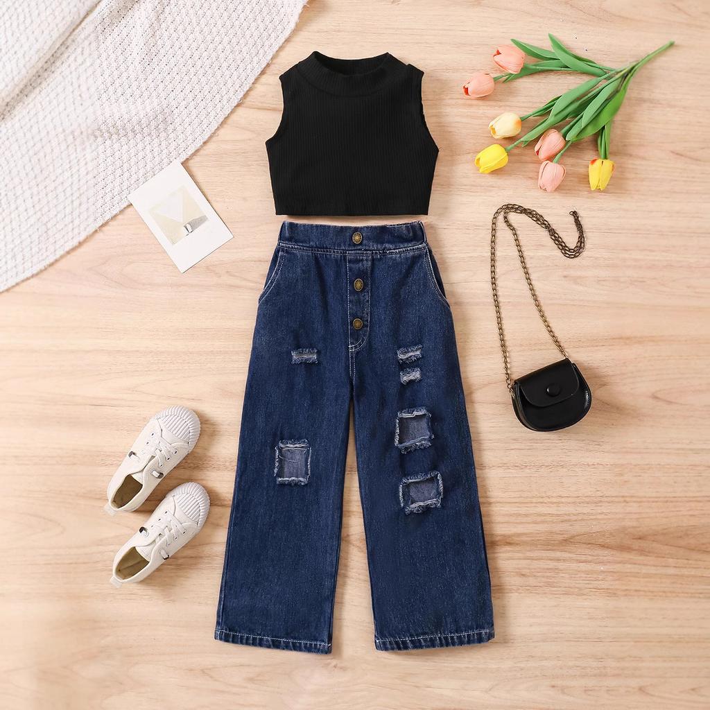 Summer Girls' Fashion Set, Children's Casual Solid-color Sleeveless Off-the-shoulder Pullover, Ripped Denim Trousers