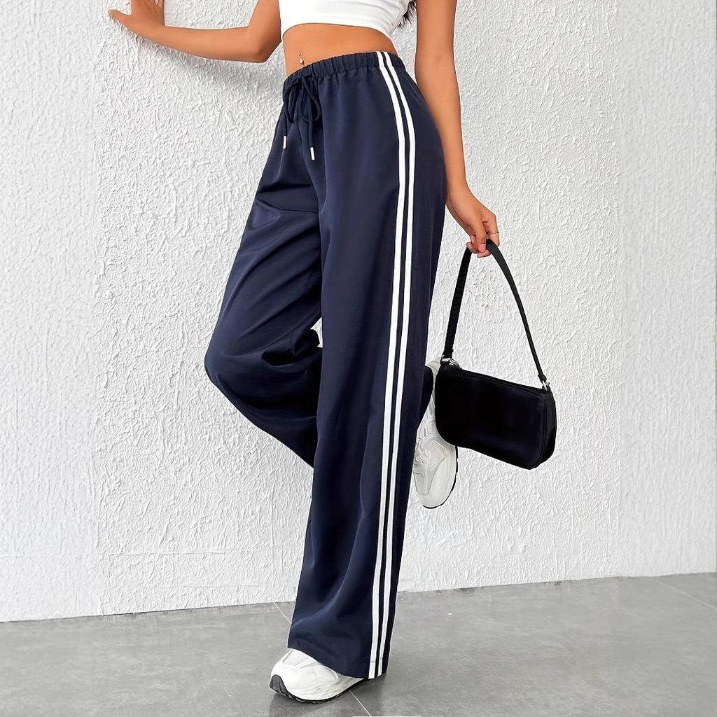 These casual high waist straight leg pants are designed for comfort and style. Made from durable polyester material, they feature an elastic waistband with a drawstring for a personalized fit. The side stripes add a sporty touch to the overall casual style, making them perfect for everyday wear and light physical activities.