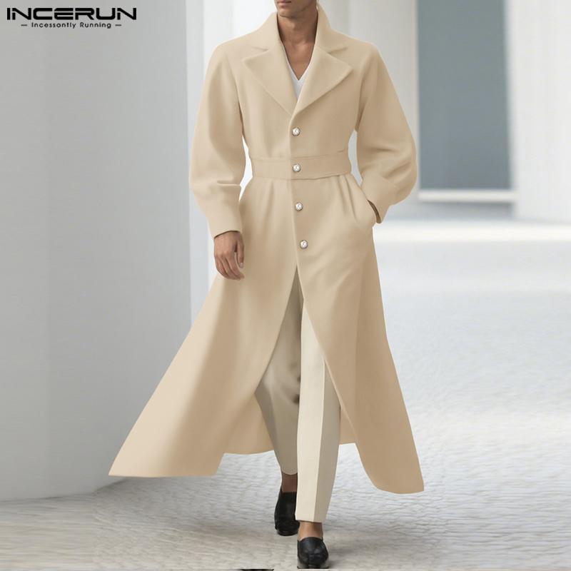 INCERUN Winter Men Long Sleeve Turn-down Collar Long Woolen Melton Coats Outwear