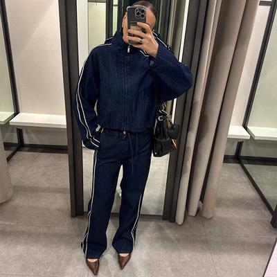 Vintage Casual Striped Denim Women Suit Zipper Pockets Jackets Straight Loose Zipper Pants Fashion 2025 Spring Solid Color Sets