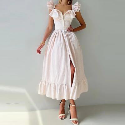 Summer New Arrival Women Clothes Sweet Style Square Collar Single Breasted Slim Fit Stripe Frill Waist Hugging Long Dress