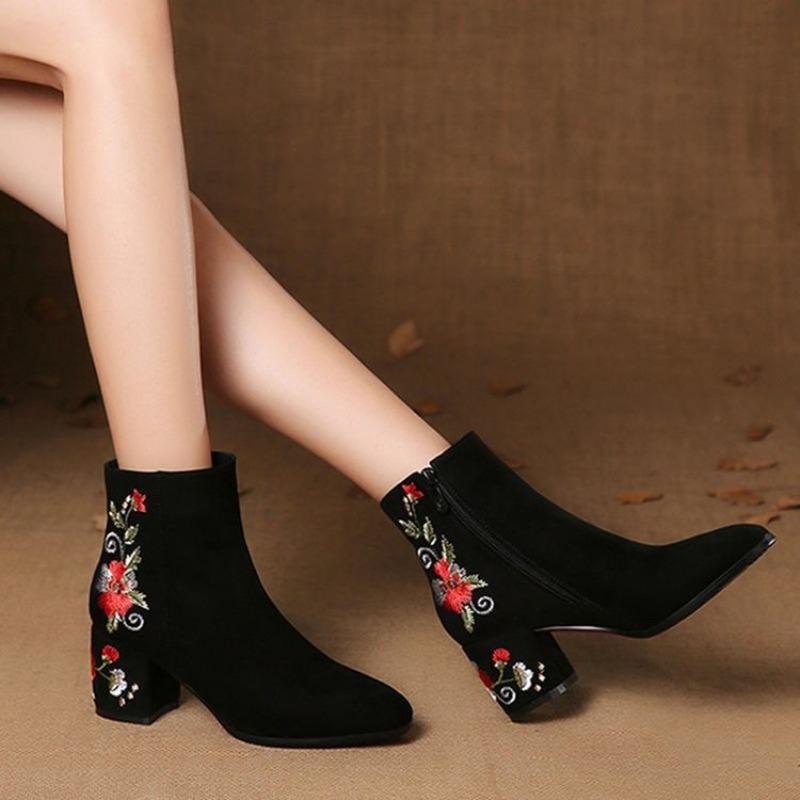 Autumn and Winter New Matte Short Boots Thick Heel Velvet Women's Shoes Soft Sole Embroidered Middle Heel Mid Boots Cotton Shoes