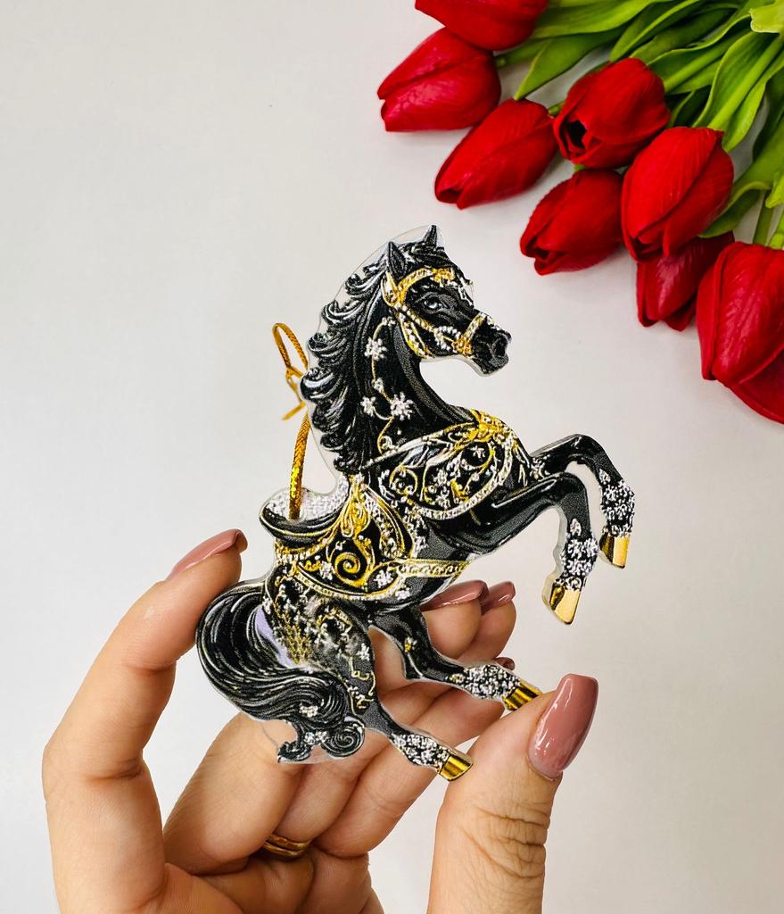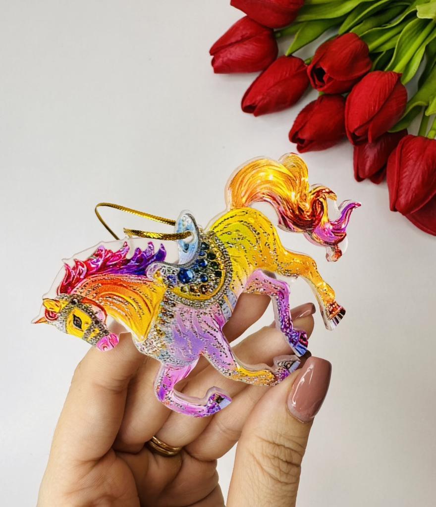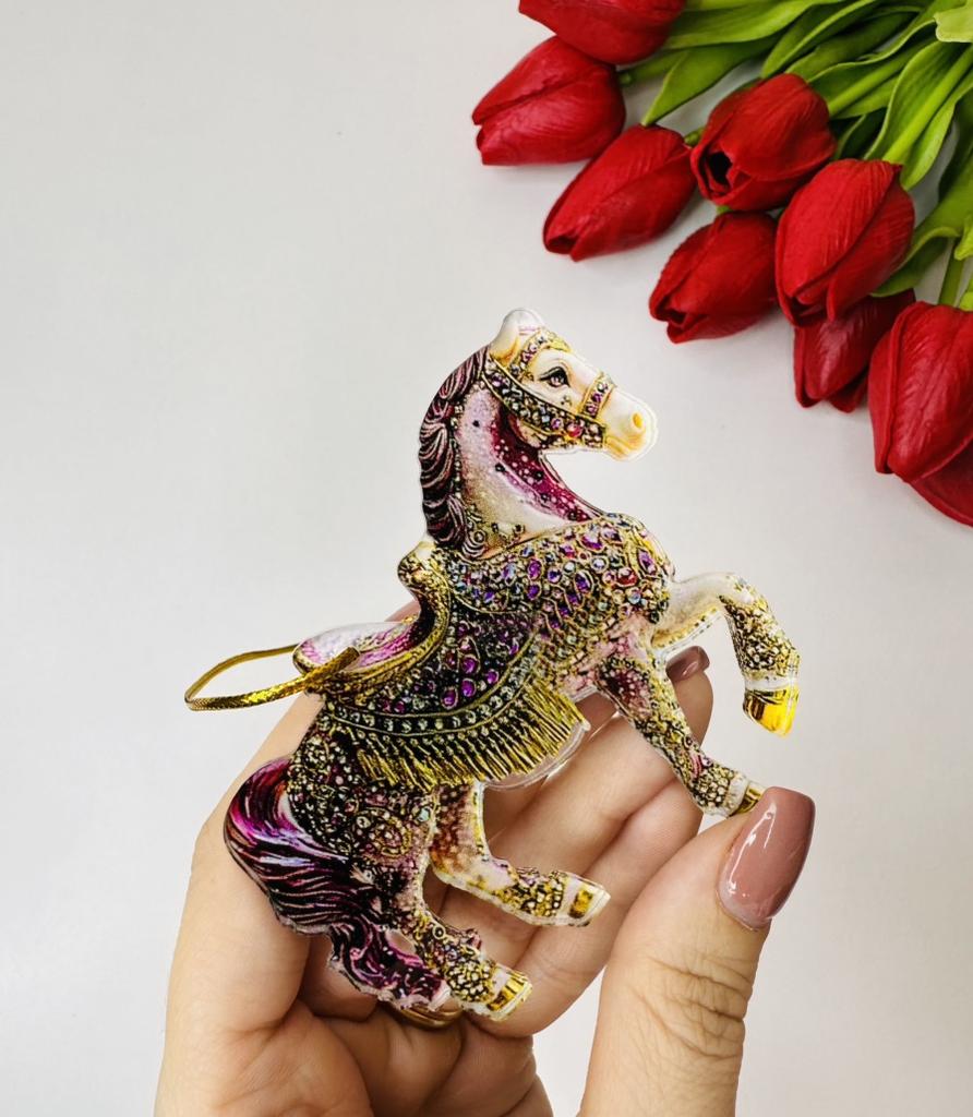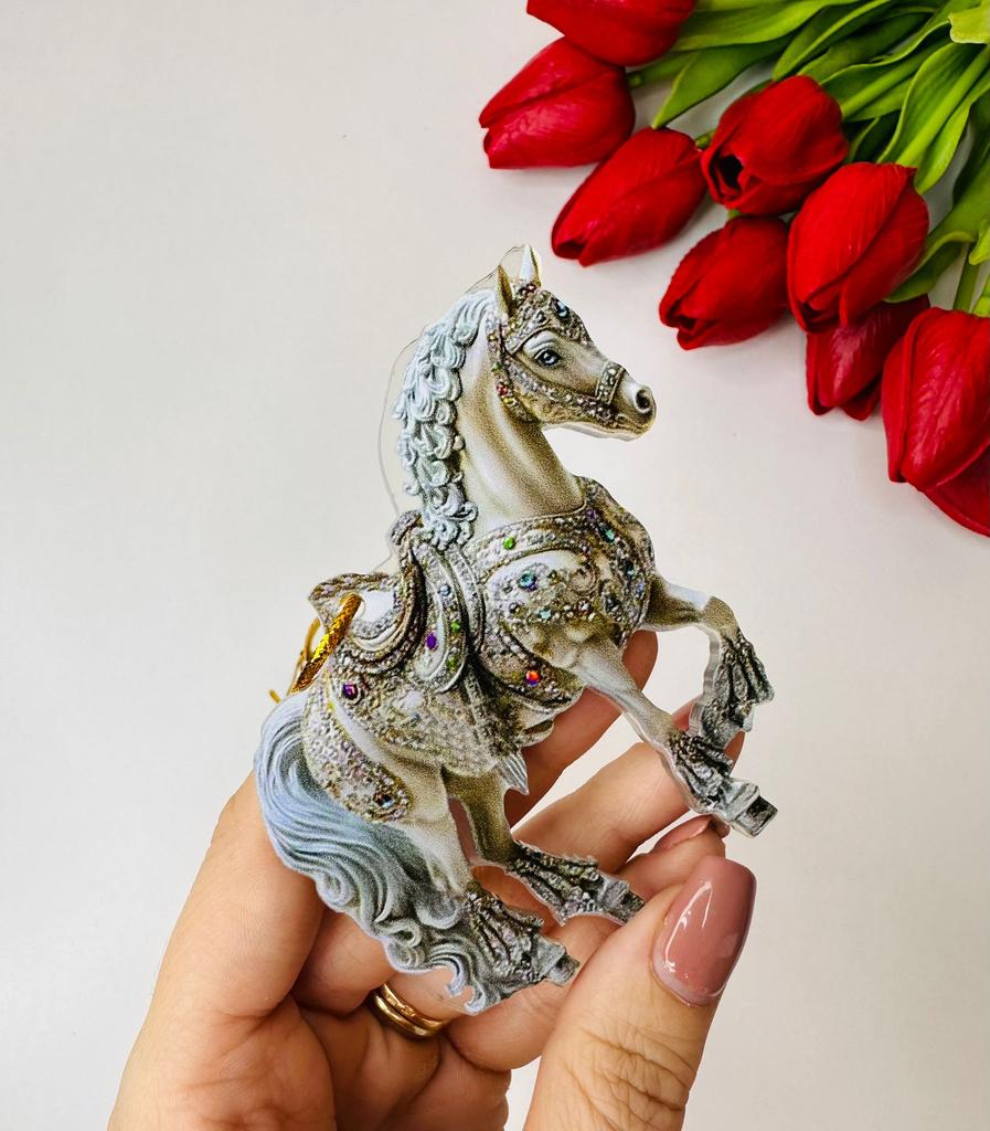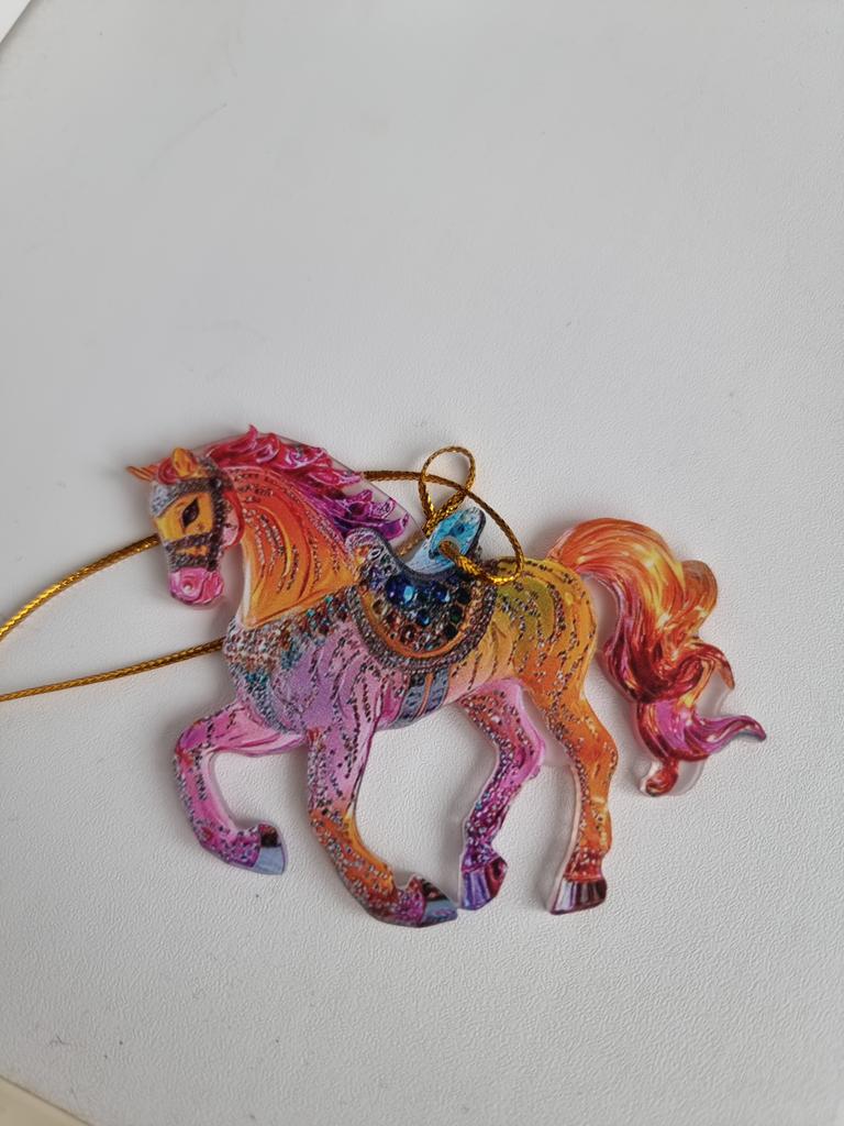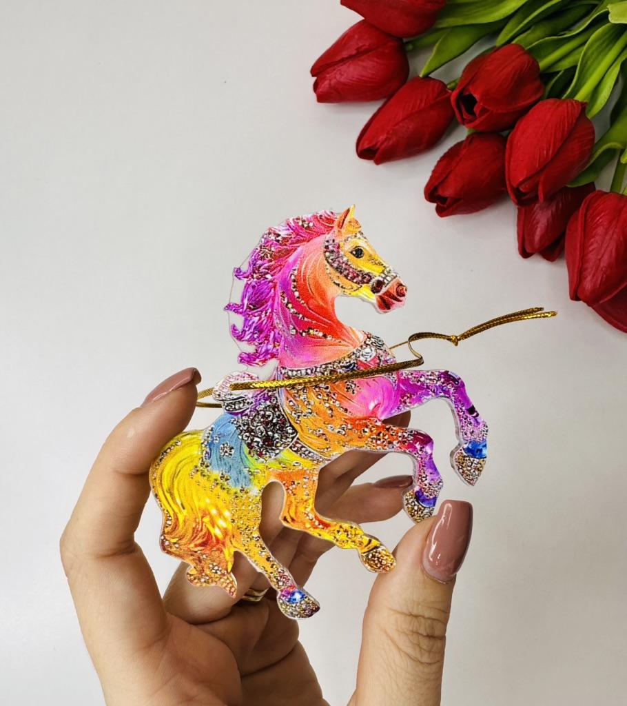 This horse ornament is a stunning addition to the Christmas tree or a unique gift for horse lovers. It is a two-dimensional pendant made of high-quality acrylic, with a magnificent and sparkling horse design inlaid with rhinestones that add a festive and elegant shine.. The compact and lightweight design allows for easy hanging on the tree, on a door, or even as a car ornament. A charming gift for women, girls, or anyone who connects with the worlds of animals, nature, and festive aesthetics. Perfect as a collectible item or as a personal gesture during the holiday season.