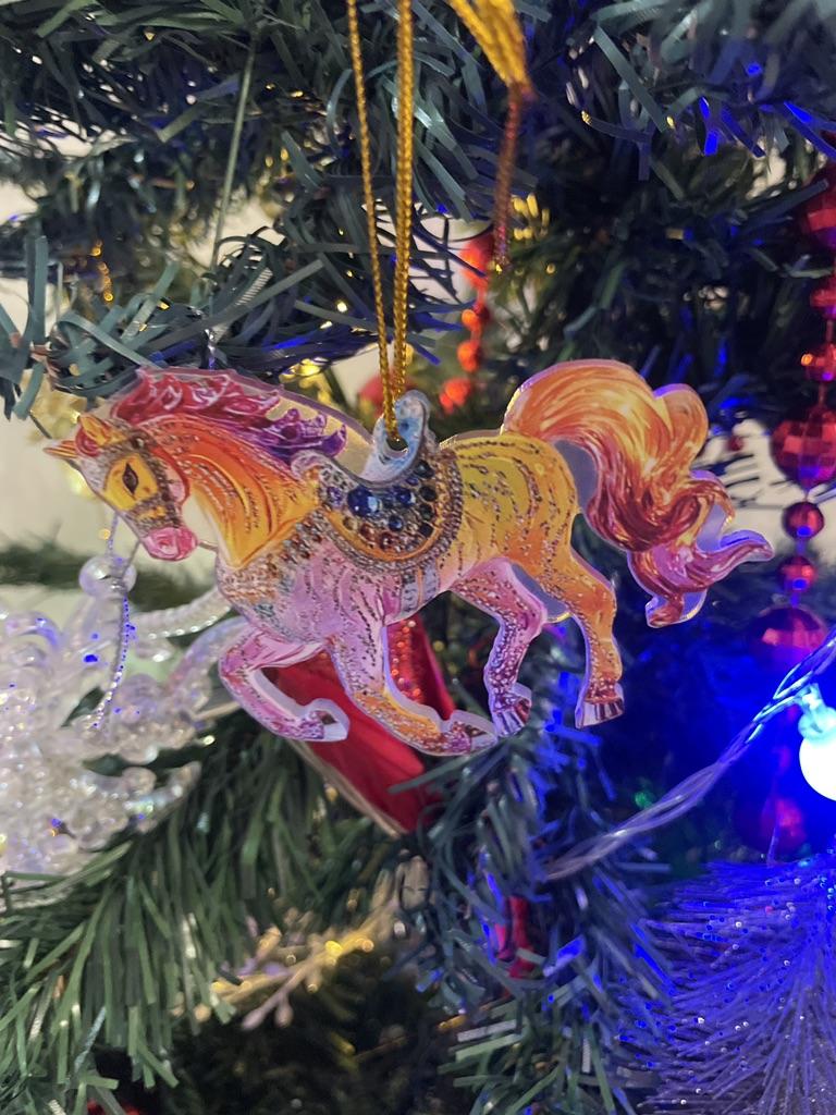 Cute 2D horse. Printed on thick plastic. The film needs to be removed from the front side. Hung on the Christmas tree as a symbol of the coming year.