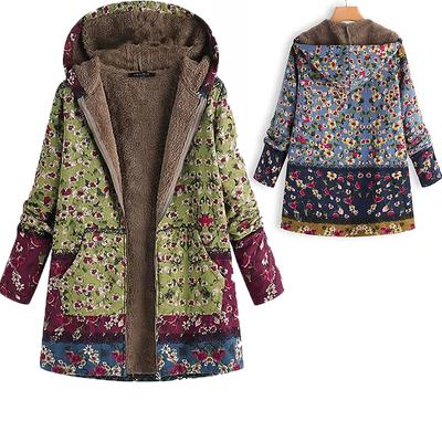 Women Casual Outwear Winter Warm Retro Printed Pockets Zipper Hooded Thicker Coat Plus Size