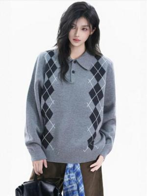 2024 British Retro Contrast Diamond Check Wool Sweater - Women's Autumn/Winter Collection