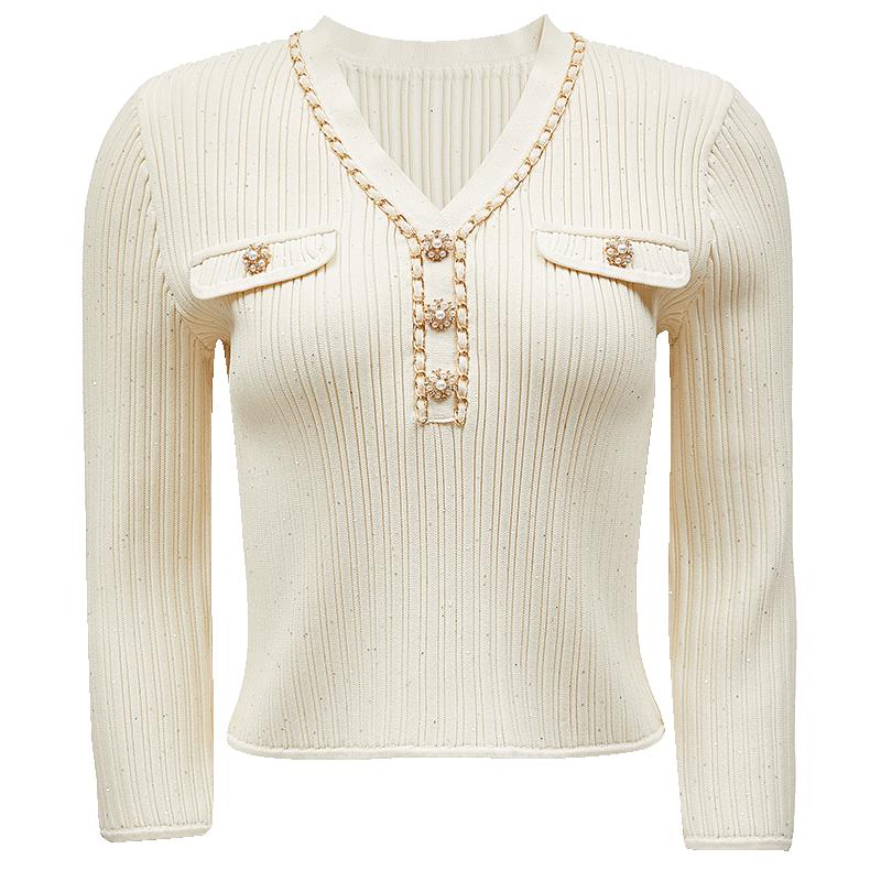 Veromoda 2025 Spring V-Neck Knit Top with Chain & Sequins