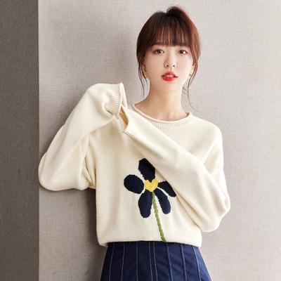 Women's Pullover Sweater Fall/winter Round Neck Loose Floral Knit Sweater