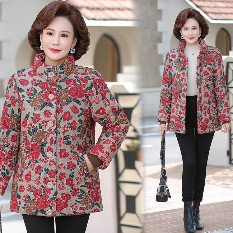 Autumn and Winter Cotton and Linen Printing Fleece Warm Cotton-padded Jacket Stand-up Collar Cotton-padded Jacket Year-old Floral