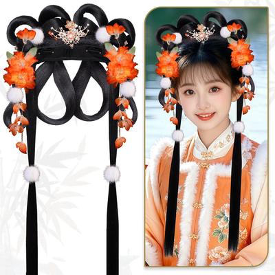 Ancient Hanfu Wig Accessory Set: Sweet Hair Bun with Tassel Flower Headdress for Women
