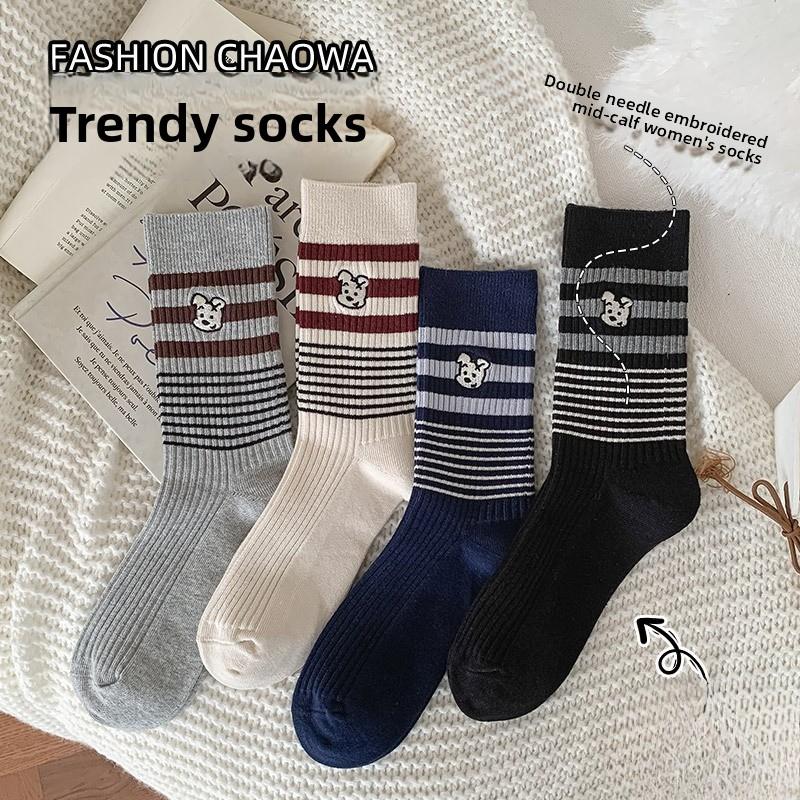 Embroidered Dog Academy Style Socks for Women, Spring and Autumn, Striped Mid-calf Cotton Socks, Retro Boneless Long Socks