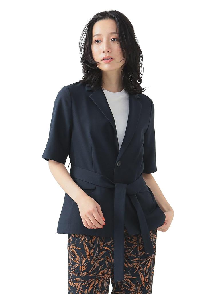 This short-sleeved tailored jacket is perfect for a summer jacket. The waist belt creates a sophisticated look.