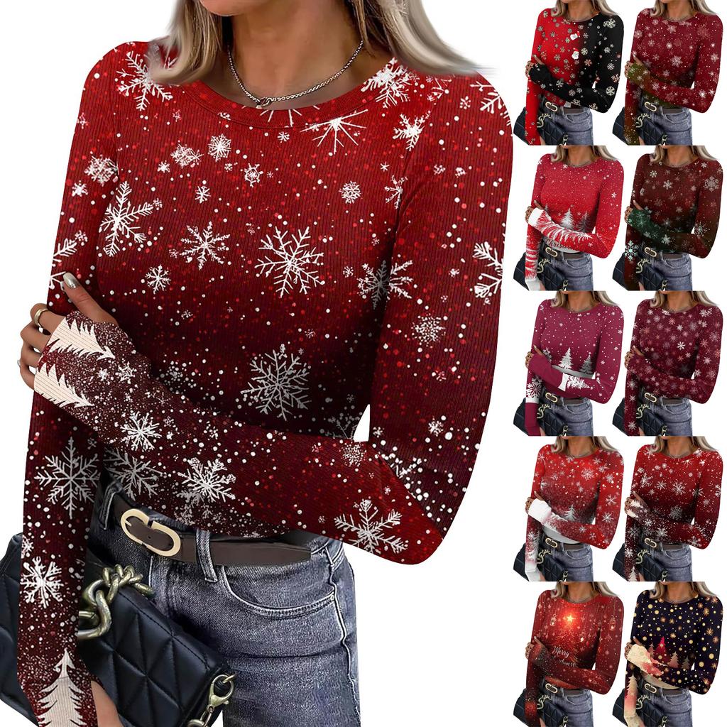 Women's Winter Slim Bottom T-shirt Fashion Casual Gradient Printing Round Neck Pullover Long Sleeve Top