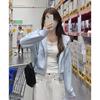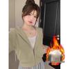 Women's Petite Gray Fleece-Lined Hooded Sweatshirt, Thickened, Short Jacket for Autumn and Winter