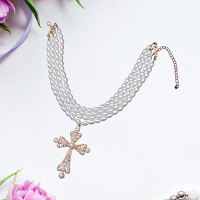 Fashionable Pearls Multilayered Necklace with Silver Sturdy Alloy Crosses Pendant Accessory for Women and Girls