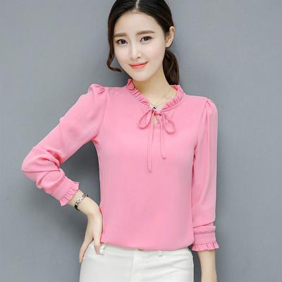 Autumn Korean Women's Pink White Blue Chiffon Blouses Fashion Slim Fit Solid Color Bottom Shirt Lace Up Tie Collar Long Sleeve Blouse