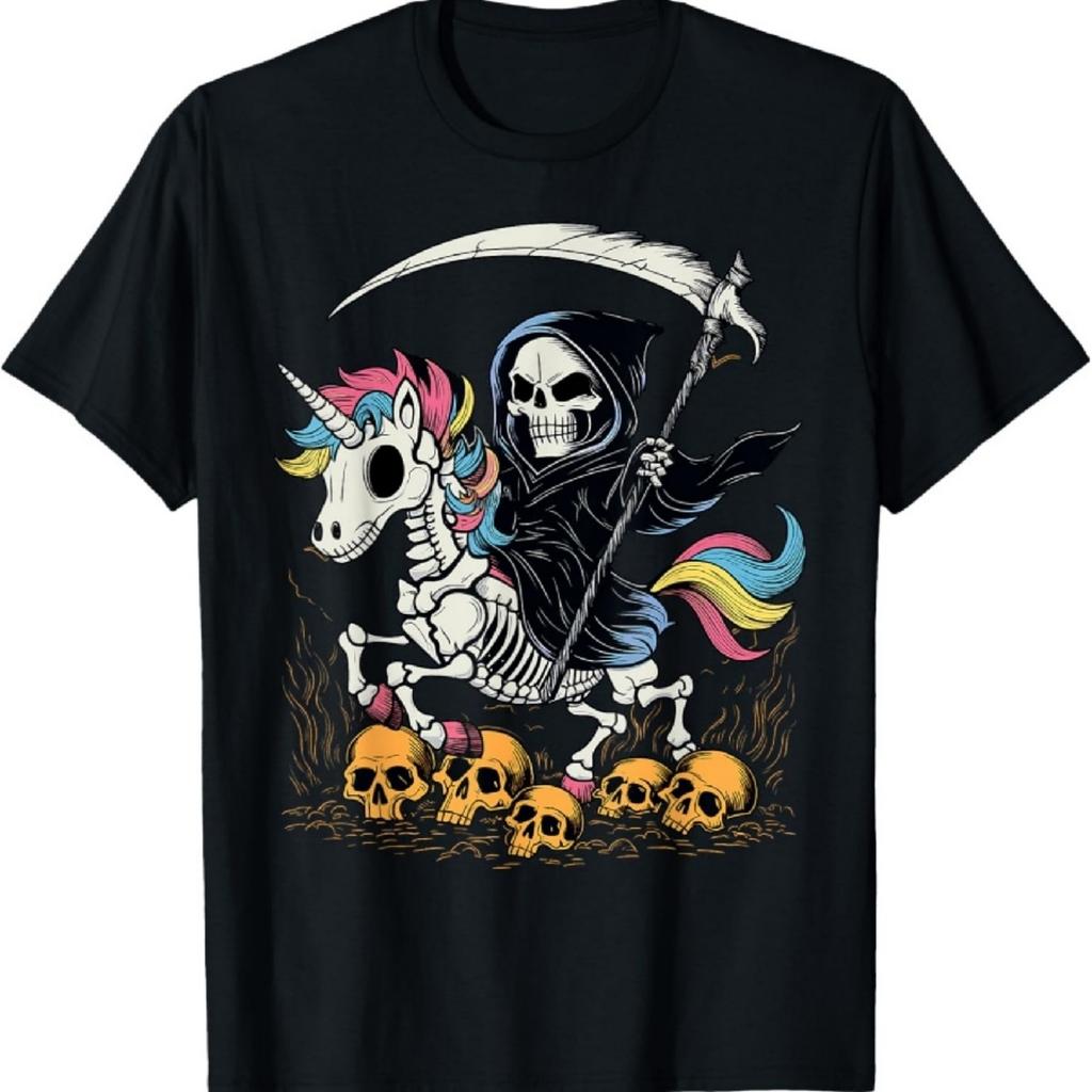 Grim Reaper Riding Unicorn Skeleton Skull Death Halloween T-Shirt